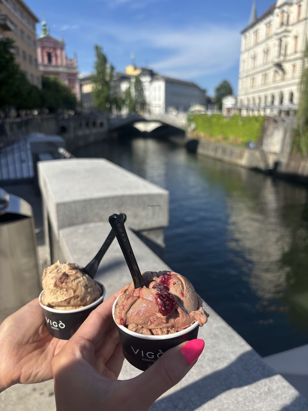 All vegan ice cream store, some water based but some made from plant mylks. Cones and cups available. I had the pistachio and returned the next day for the lemon. The lemon was delicious, zingy flavour and very smooth. Shop is a takeaway, no indoor seating but has a few seats outside. Close by to triple bridge and elevated from street level which offers wonderful views up the river.