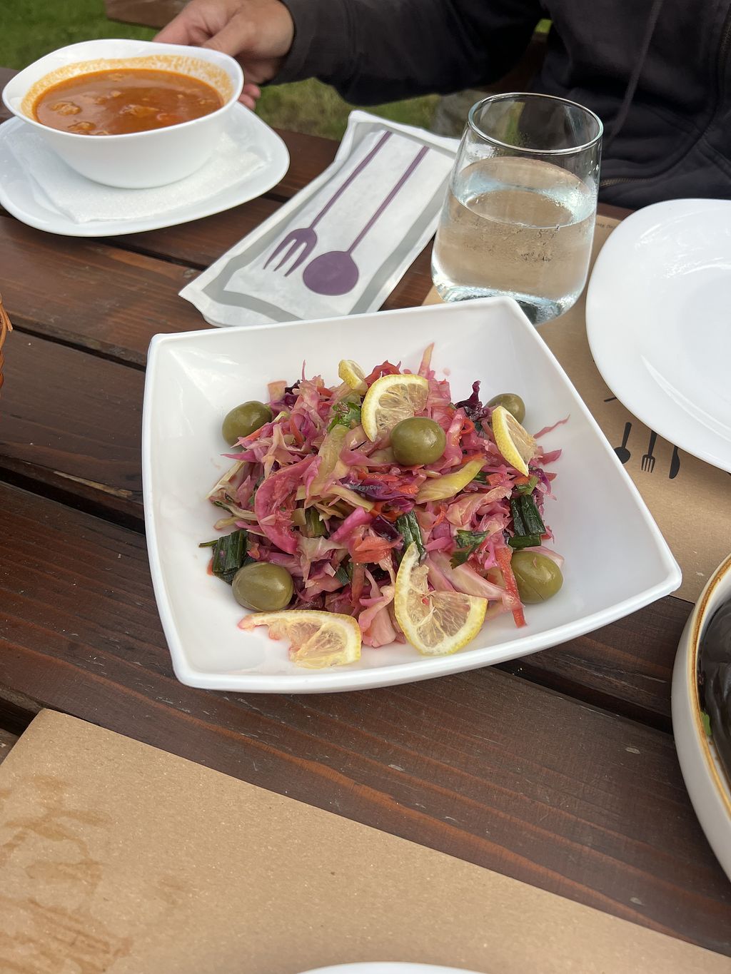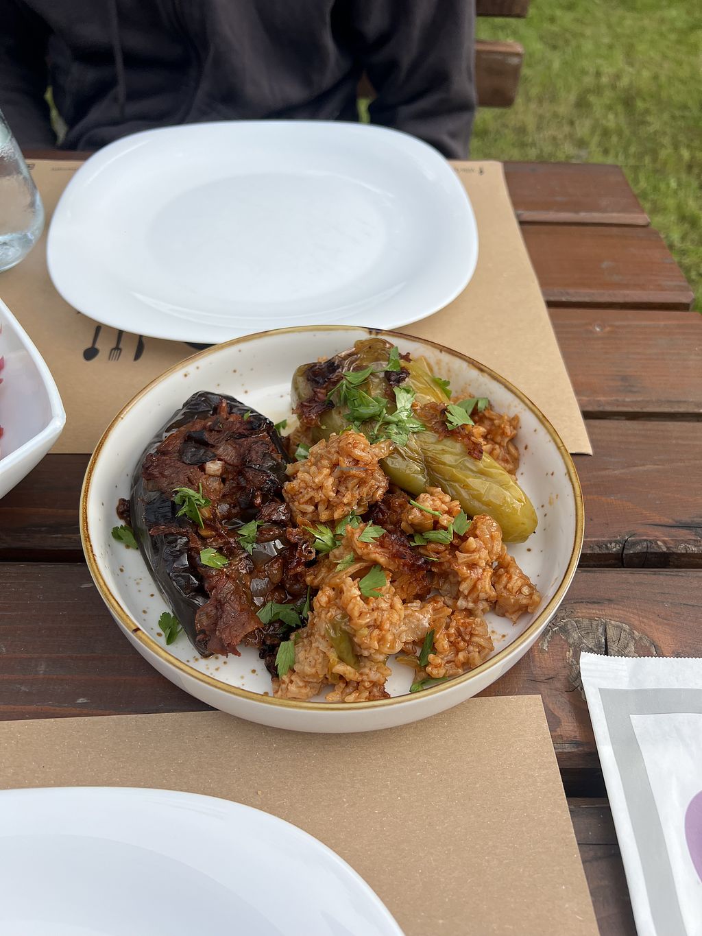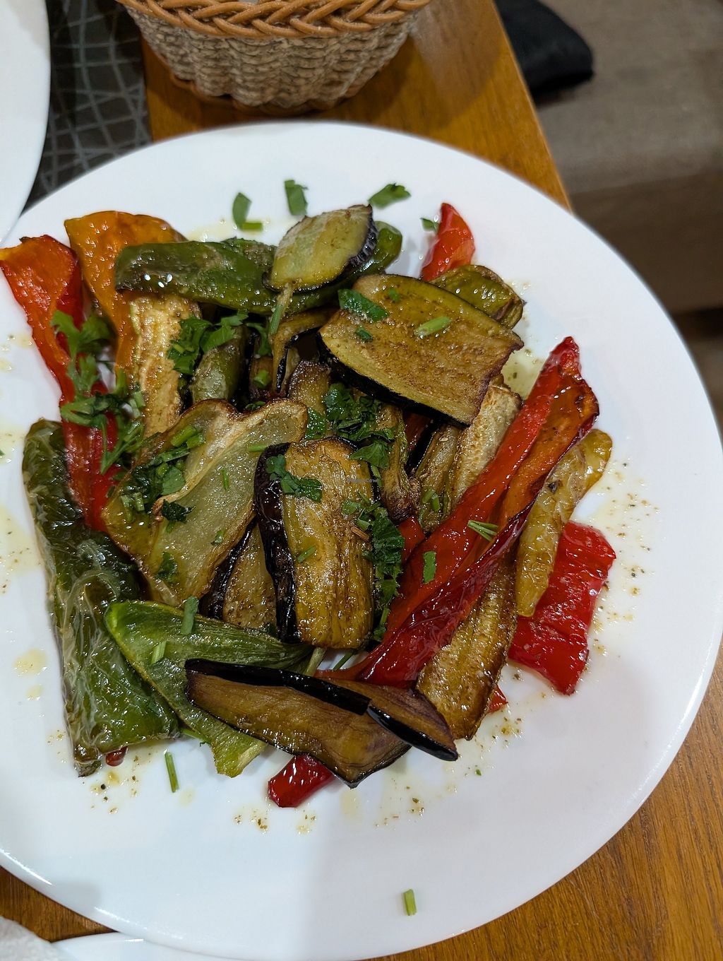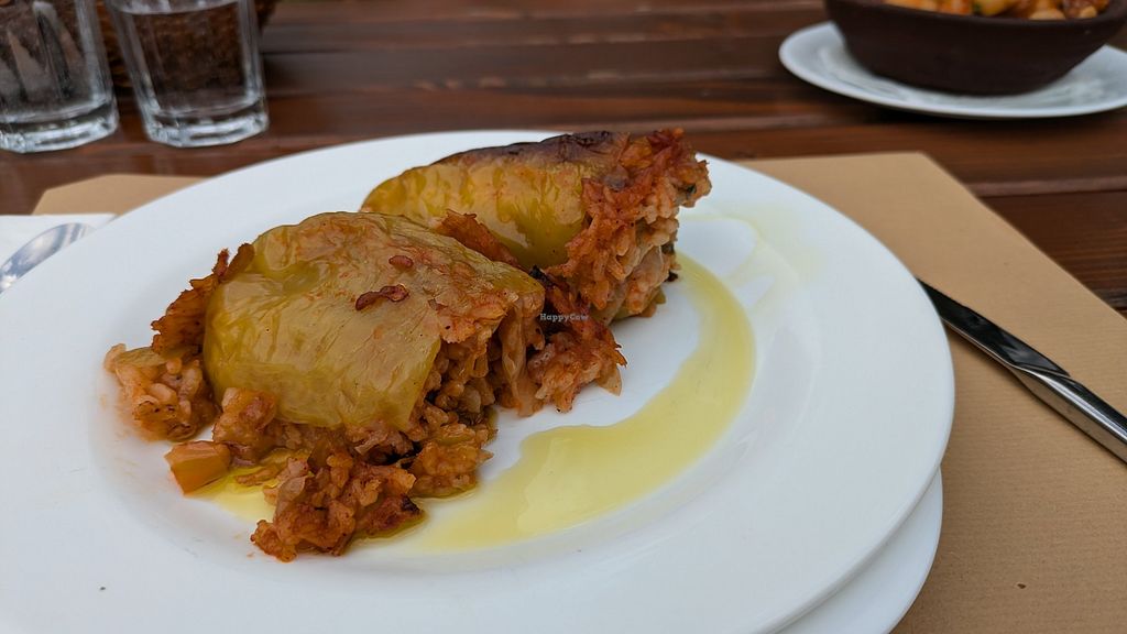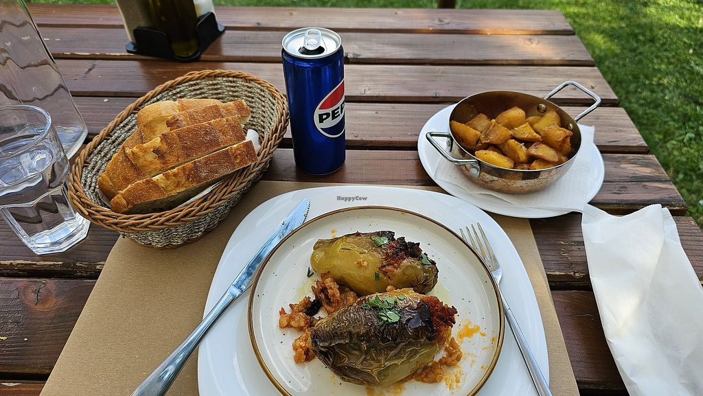 Our dinner was amazing! The seating outside was lovely. Got the stuffed eggplant and capsicum (the waitress offered half and half instead of just one of them), as well as a cabbage salad which was a special of the day. The free bread was great too!