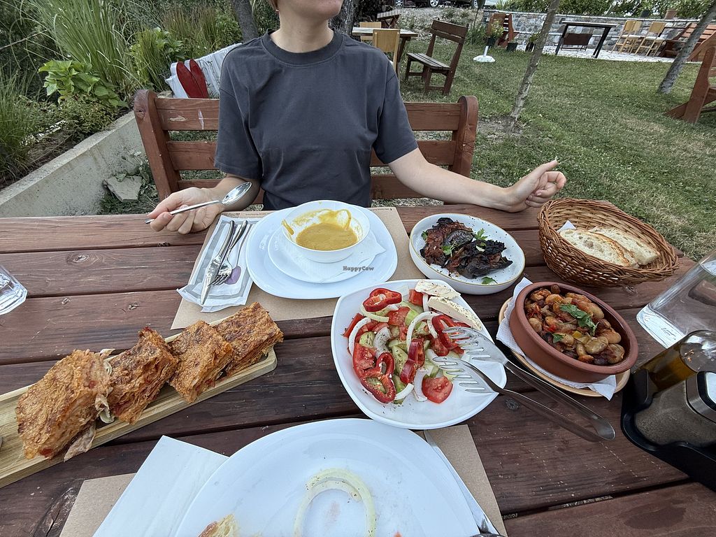 Serves meat, vegan options available. Guesthouse and restaurant serving local dishes with a focus on seasonal produce. Vegan dishes may include roasted vegetables, oven-roasted potatoes, jumbo beans braised with vegetables, village salad, vegetable soup and more. Open Mon-Sun 8:00am-9:30pm.