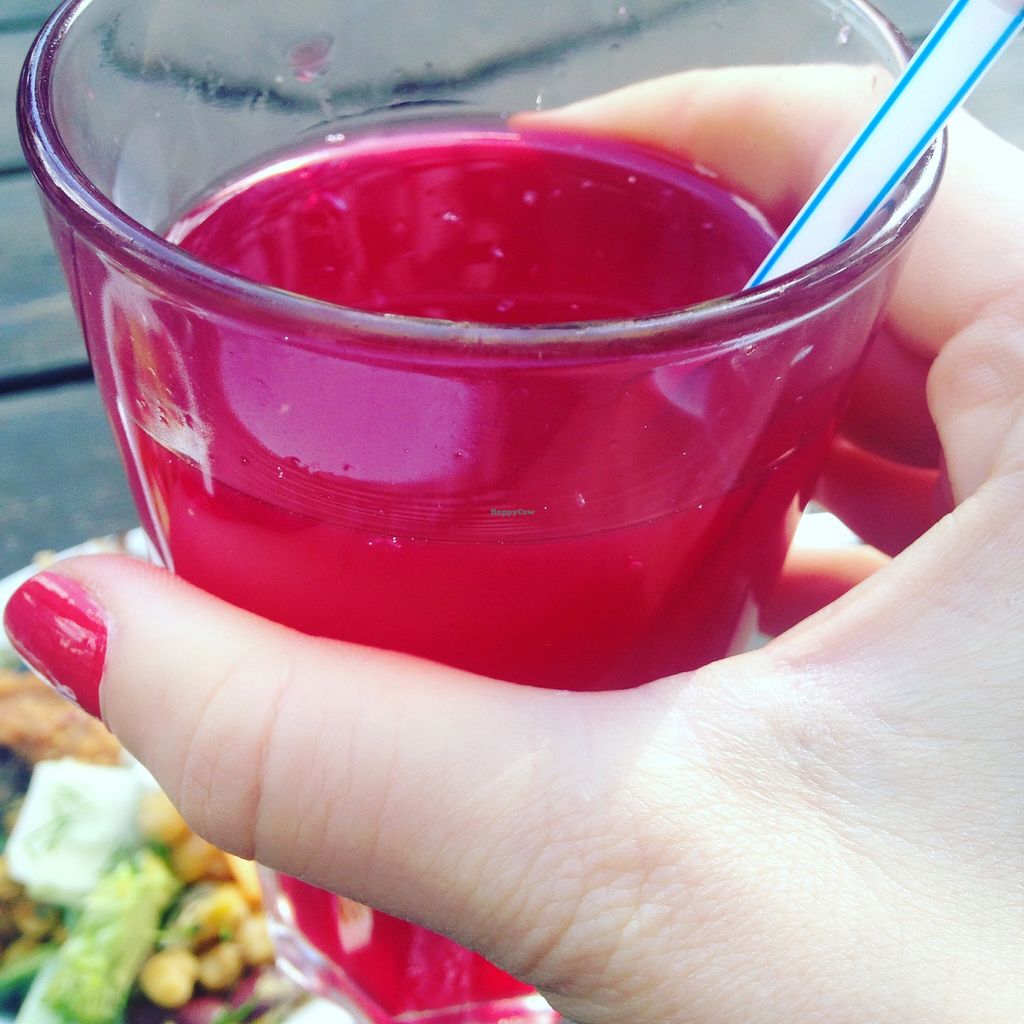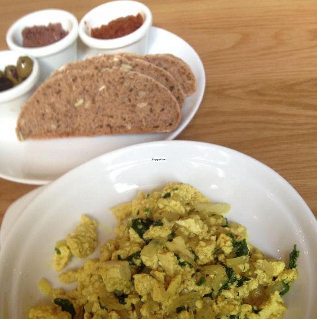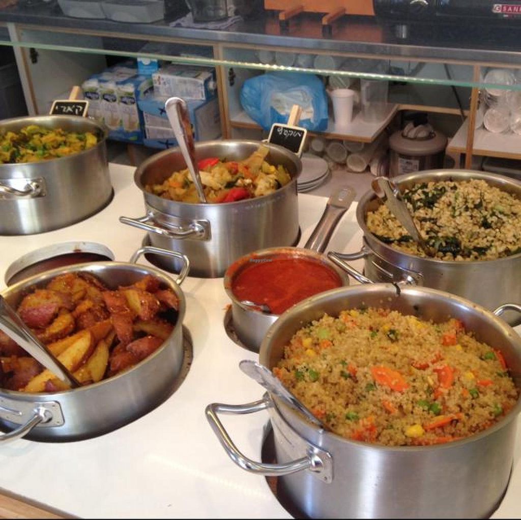 I'm very glad that Village Green has opened this new all-vegan cafe/restaurant in Tel Aviv! There is quite a large selection of hot and cold foods, breakfast, and desserts. You can avail yourself of the self-service hot and cold bars by paying for the large or small portion and you are given bowls that you can fill with whatever strikes your fancy. The hot bar has all kinds of stews like curried vegetables and the cold bar is basically a salad bar with some nice touches in addition to vegetables like black lentil salad, macaroni salad, spicy tofu cubes and much more. The breakfast is big and comes with scrambled tofu, dark bread, spreads, a self-service salad, fresh-squeezed juice (even pomegranate in season) and a hot beverage, which you can have made with soy or almond milk.