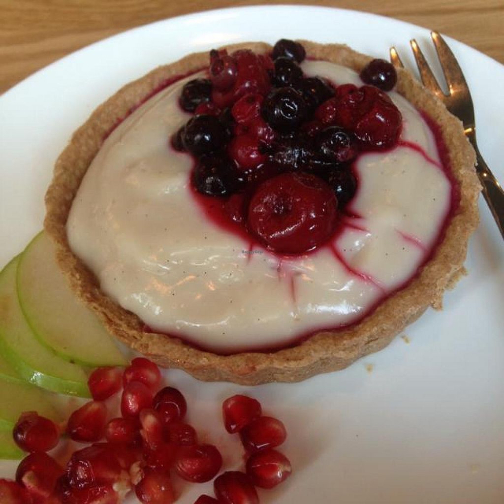 The desserts are made with whole wheat flour and no sugar. Instead, natural sweeteners like apple juice are used. There are muffins, tiramisu, a fruit and almond cream tart, and more. The selection will vary from day to day.