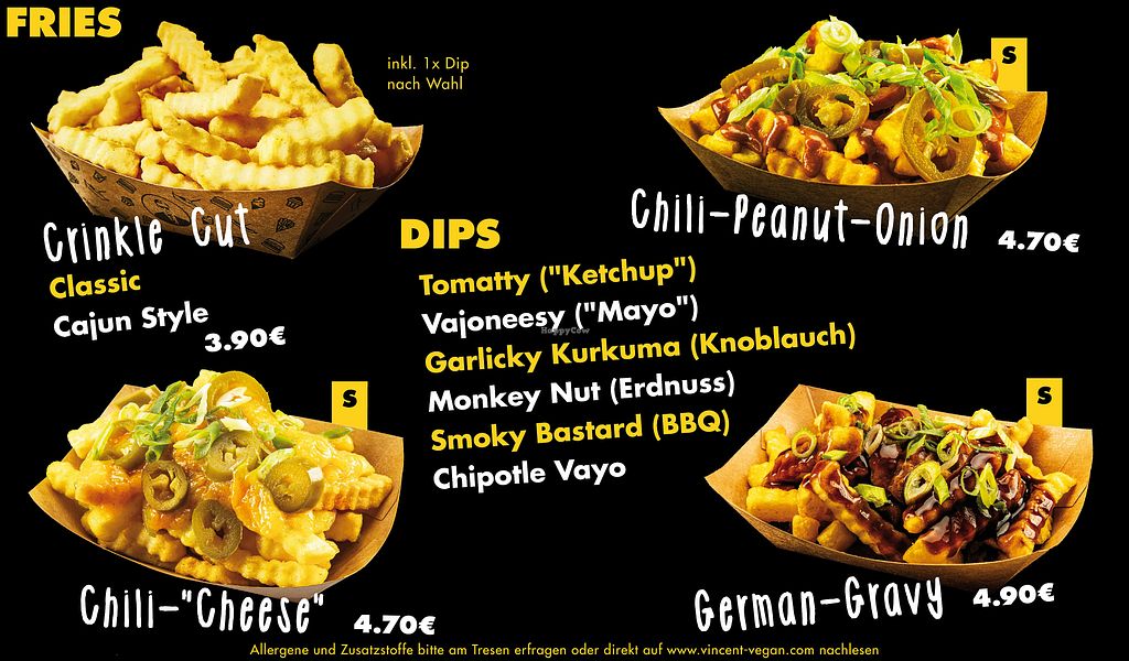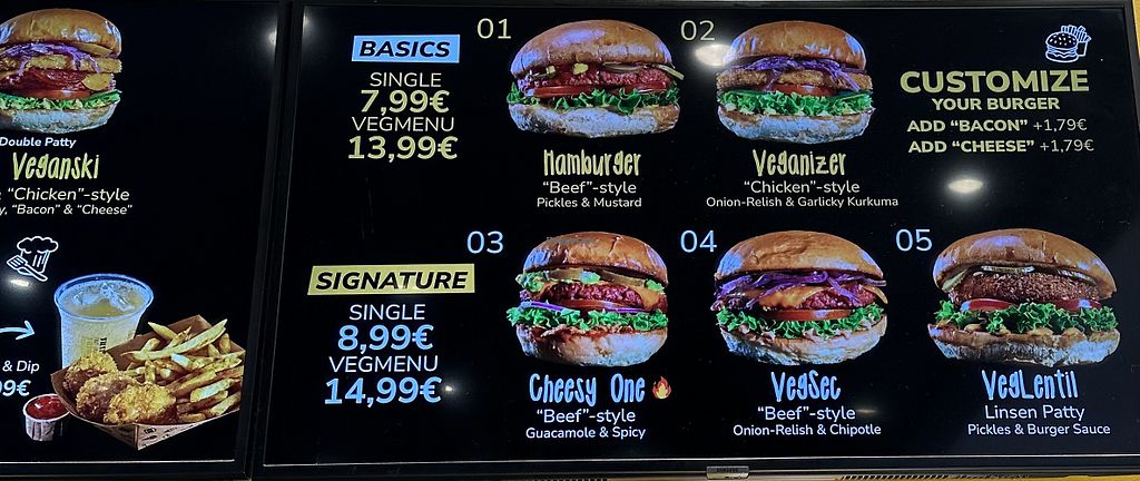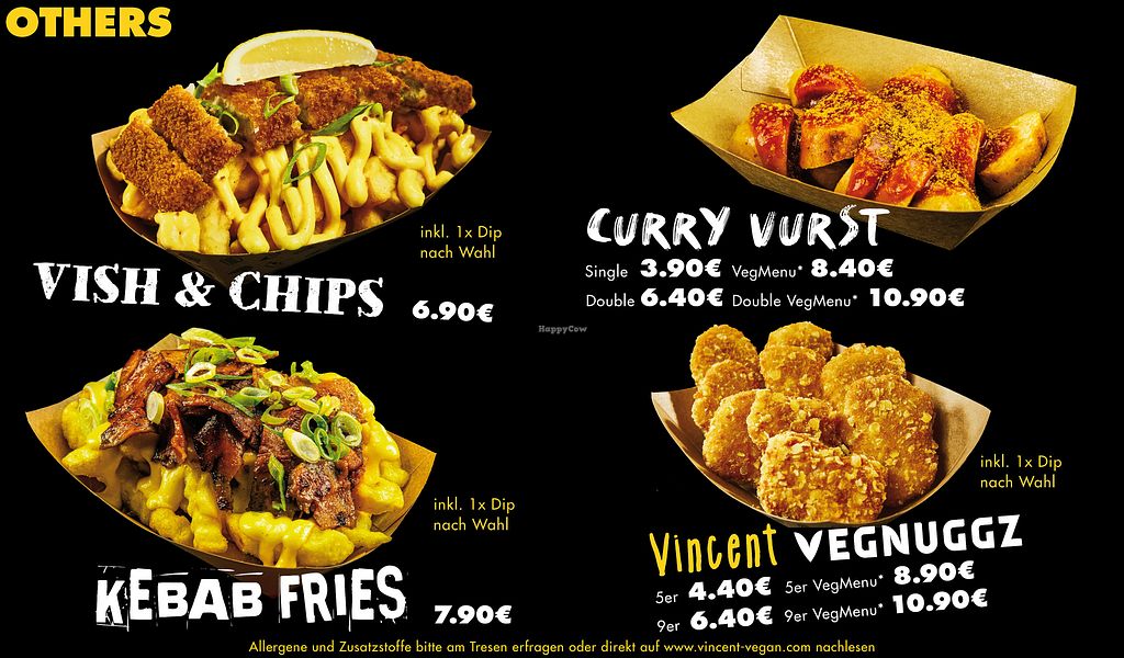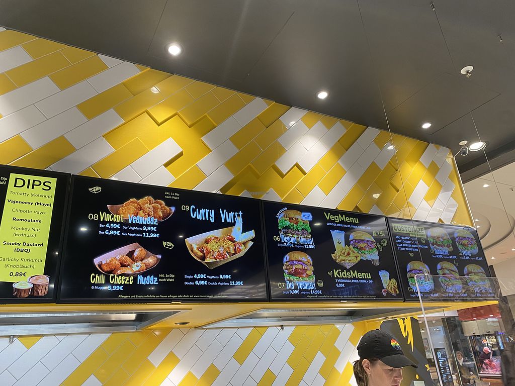 Große Auswahl an veganem Fastfood. Curryvurst, Kebab Fries, diverse Burger, Nuggets, etc.
