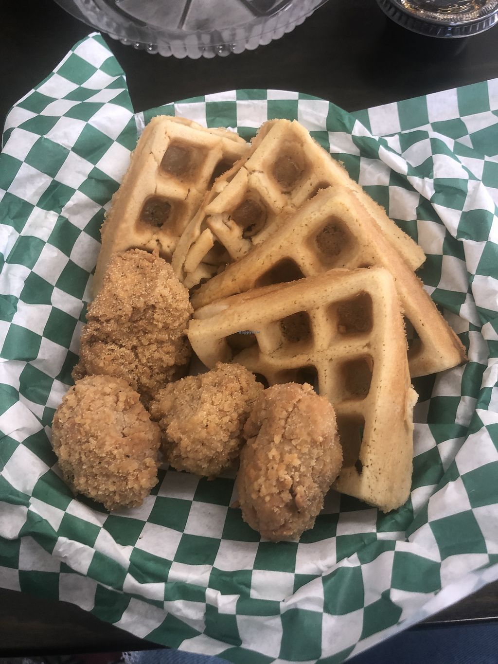 Vegan Chicken and waffles. The chicken is the same breaded cauliflower…