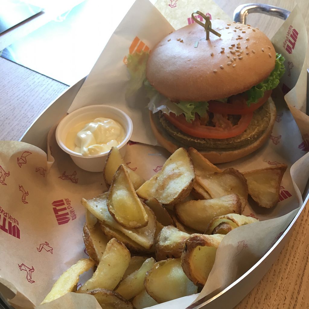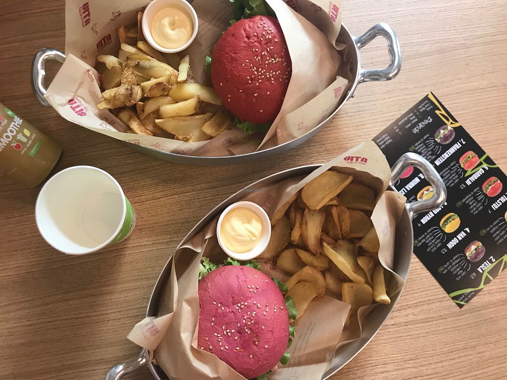I've been in this place with a friend, close to the city center. Such a nice discover! Colorful, completely vegan burgers, they are really tasty and there is a lot of choice! The chips are also excellent. The place is small, but very cute.