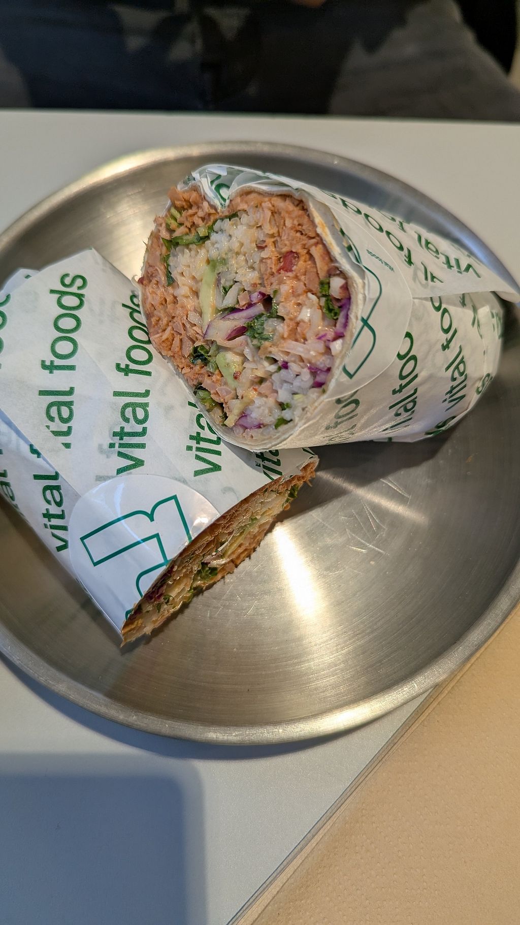 Had a burrito with jackfruit filling. Was served warm and closed. Good taste, composition and fresh thanks to some drops of lemon juice. Was a surprisingly filling and tasty meal.