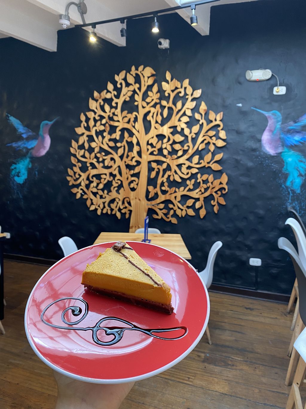 Lúcuma-Cake in front of the mural at their restaurant near the main sq…