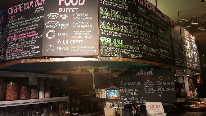 Truley vegan and super healthy food. you wont find any sugar or junk food here yet the desserts are absolutely delicious. eat here before 5pm and its really cheap ... fill a box for less than £8 from a healthy buffet with lots of creative dishes. in the evening food is weighed so costs more , although they still do take outs at day prices. Juices and smoothies are amazing. Owner and staff superfriendly and very hospitable.