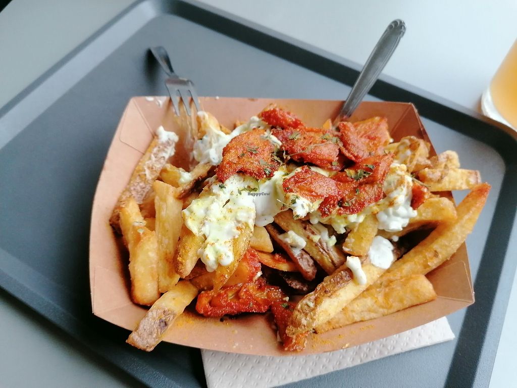 Serves meat, vegan options available. Loaded French fry shop with vegan options, sauces and beers. Open Tue-Thu 18:00-23:00, Fri-Sat 18:00-00:00, Sat 12:00-15:30, Sun 12:00-16:00.