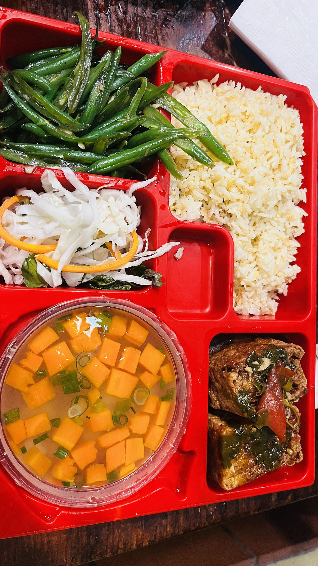 Lunchset 2: tofu, mushrooms soup, rice, eggplants, and green beans