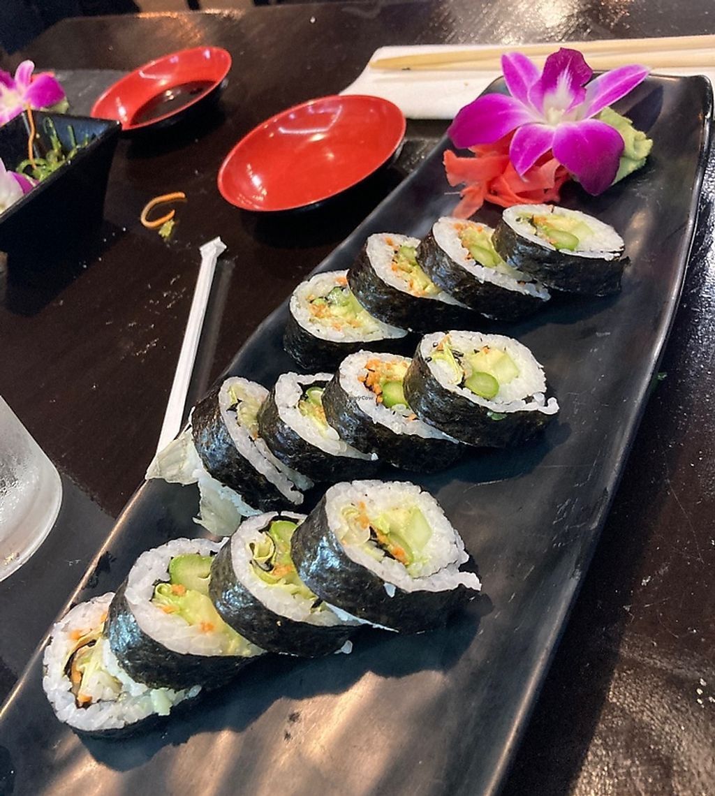 Serves meat, vegan options available. Japanese food and sushi but has vegetable roll as well as cooked dishes with tofu. Ask for vegan. Open Mon-Thu 11:00am-9:00pm, Fri-Sat 11:00am-10:00pm, Sun 11:00am-9:00pm.