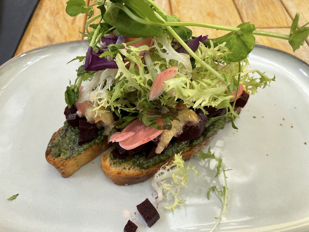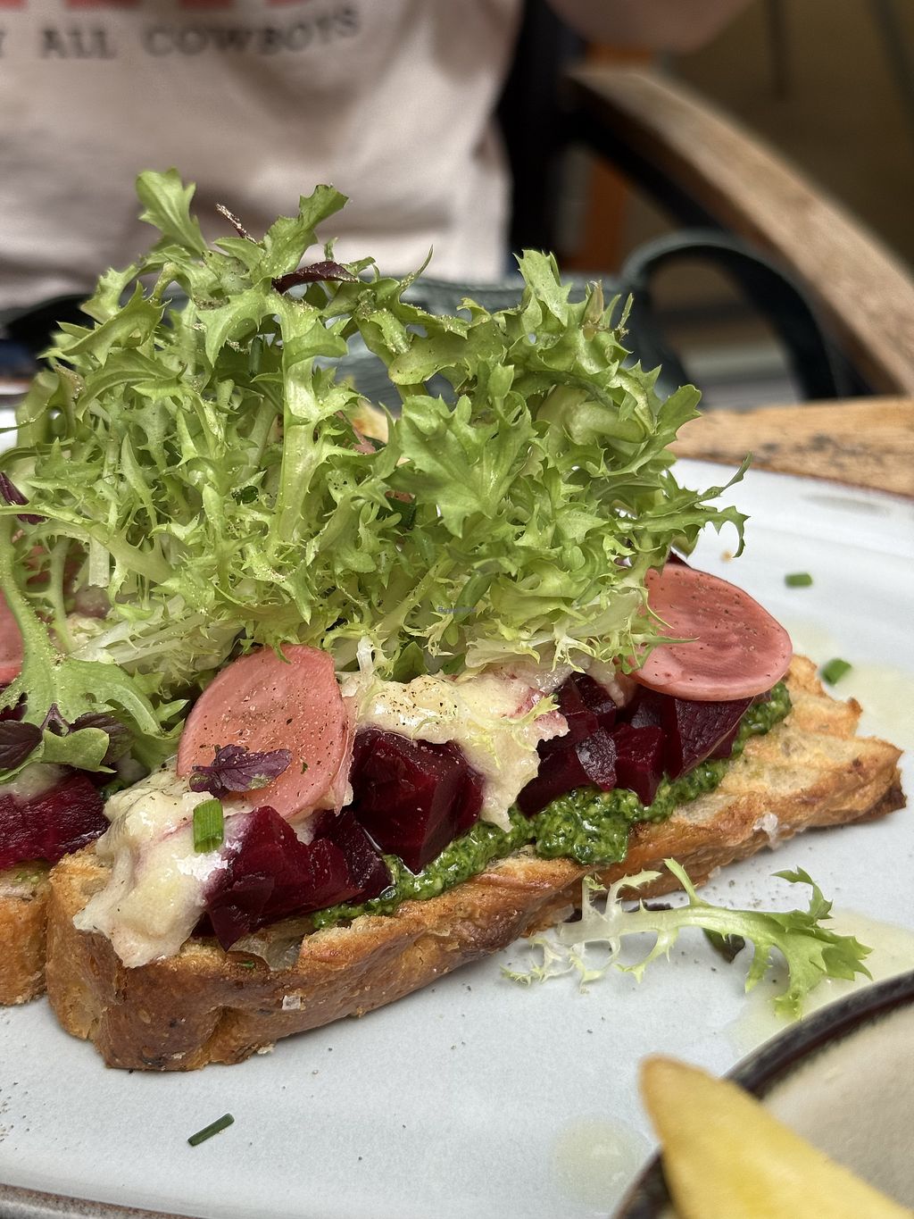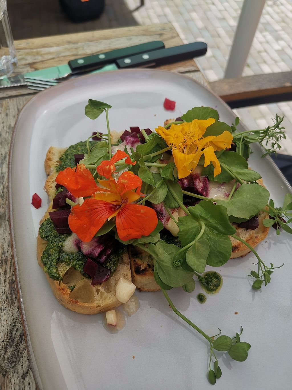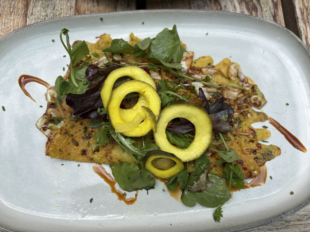Vegan pancake with beets, apple, lettuce mix, nut mix and vegan feta.