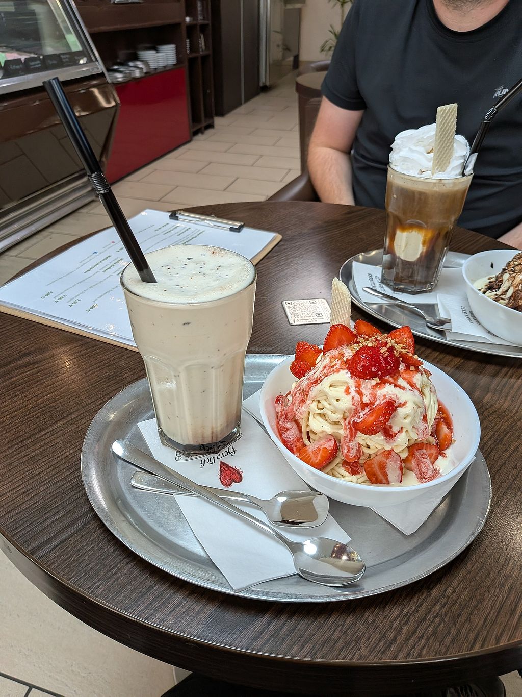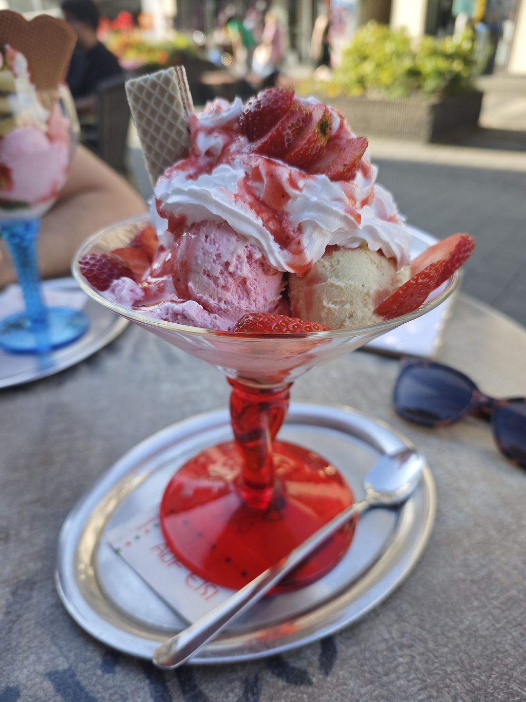 Ich hatte nach der veganen Karte gefragt und war überrascht, als ich direkt mehrere Seiten mit Auswahl bekam. Der vegane Erdbeerbecher war sehr sehr lecker, sogar mit veganer Sahne. Hier konnte ich dann frei vier Kugeln wählen. Das Neapolitanereis ist auch sehr zu empfehlen.