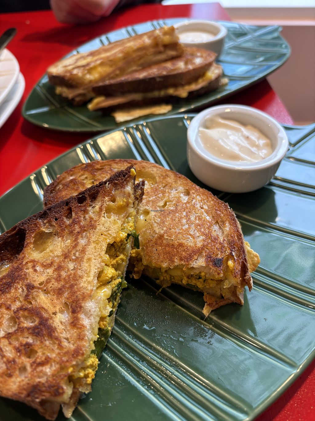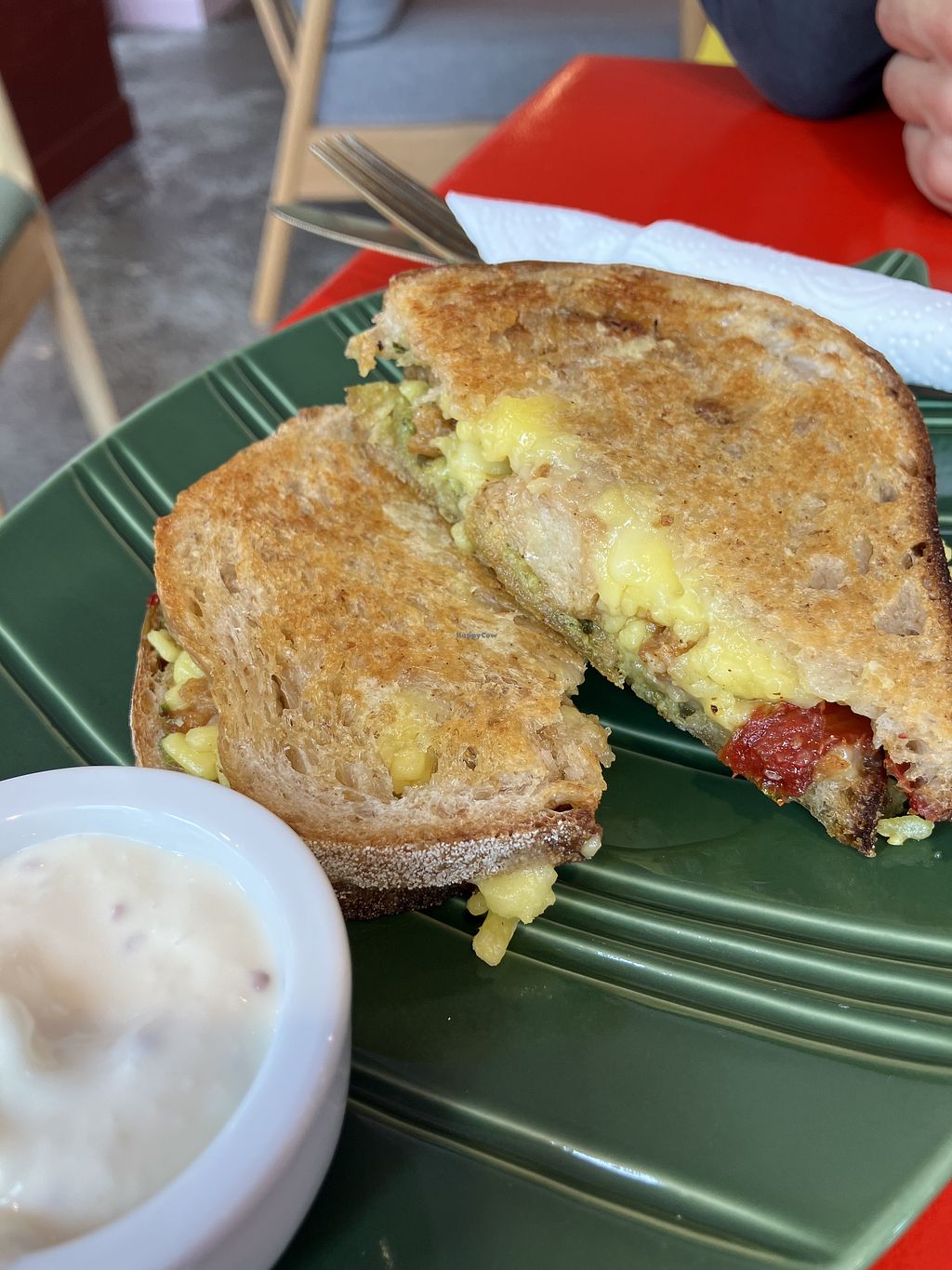 Toastie with chicken, cheese, pesto and sundried tomatoes