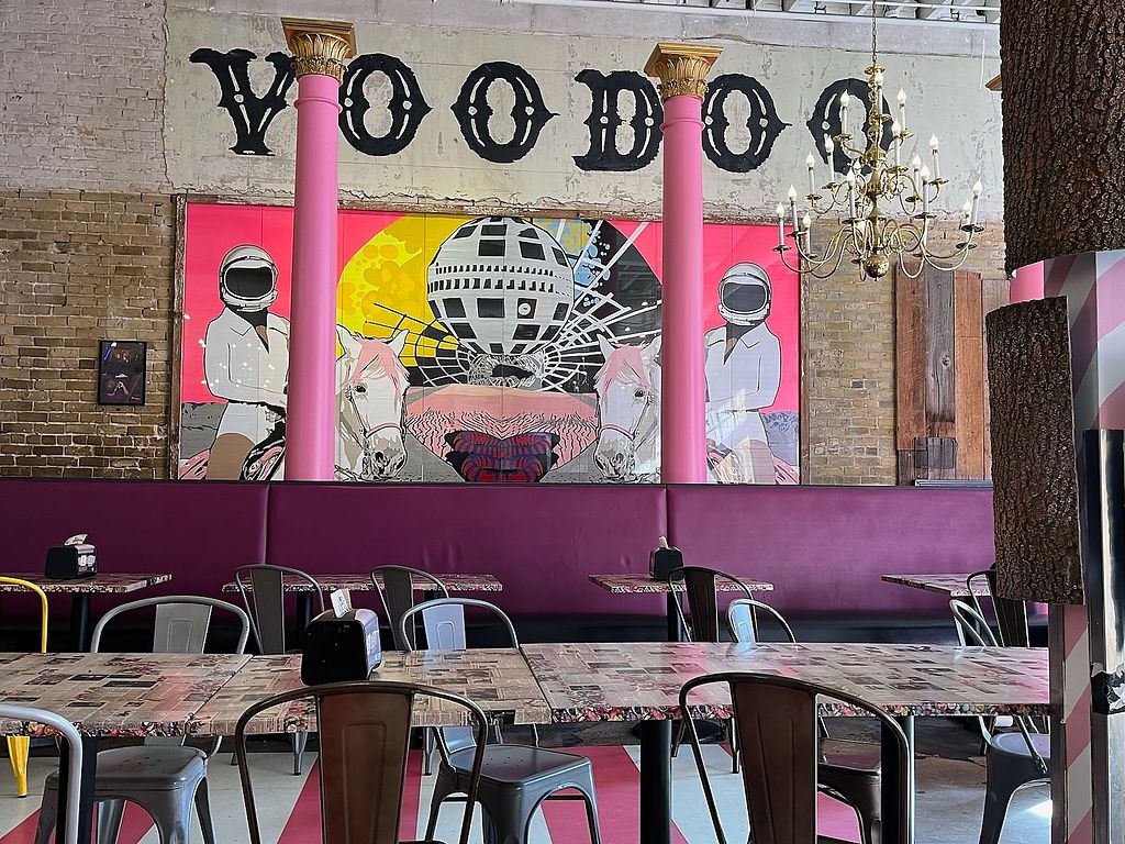 I got the Portland cream and the apple fritter. They taste just like I remember donuts tasting before going vegan! There were quite a few vegan options which I tried to capture in the picture as the case rotated. Super fun atmosphere downtown Austin…so win win!