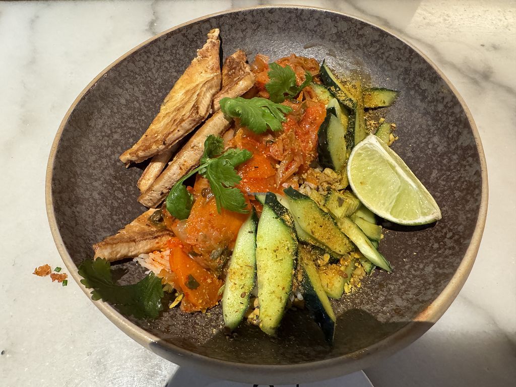 Katsu sando sandwich, spicy cucumber on top, seitan inside