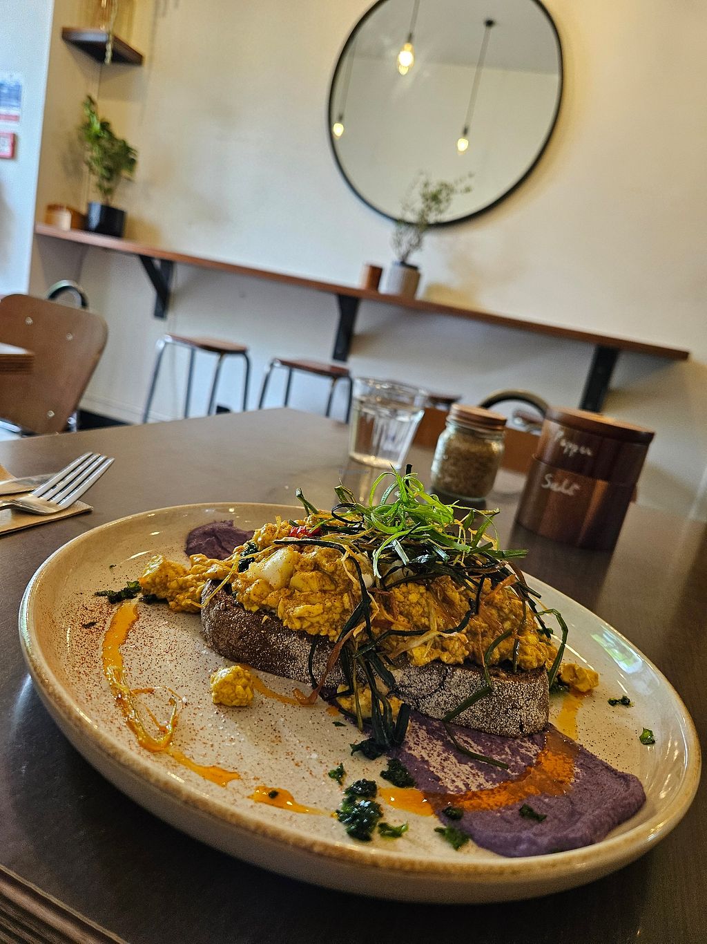 Such a lovely little spot in a great location. Always love the variety of vegan options—both on the menu and in the cabinet. Had the tofu scrambled which has lots of flavour!! The cakes and sweets are seriously good. Vegan muffins never miss, but the chocolate ganache brownie, honestly next level. So good.