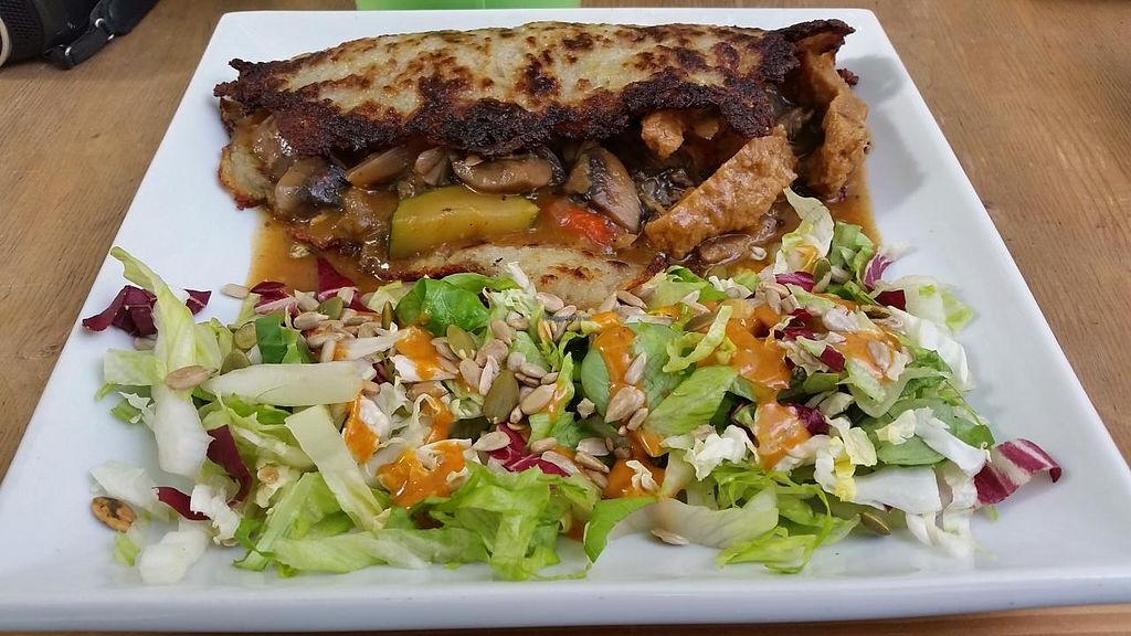 Placek po wegiersku or seitan and veggies in potato pancake