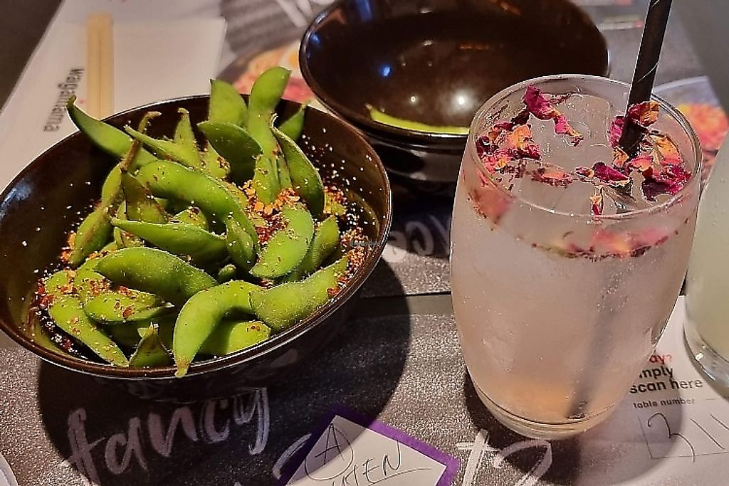 Edamame beans with chili garlic salt + Cherry blossom lemonade
