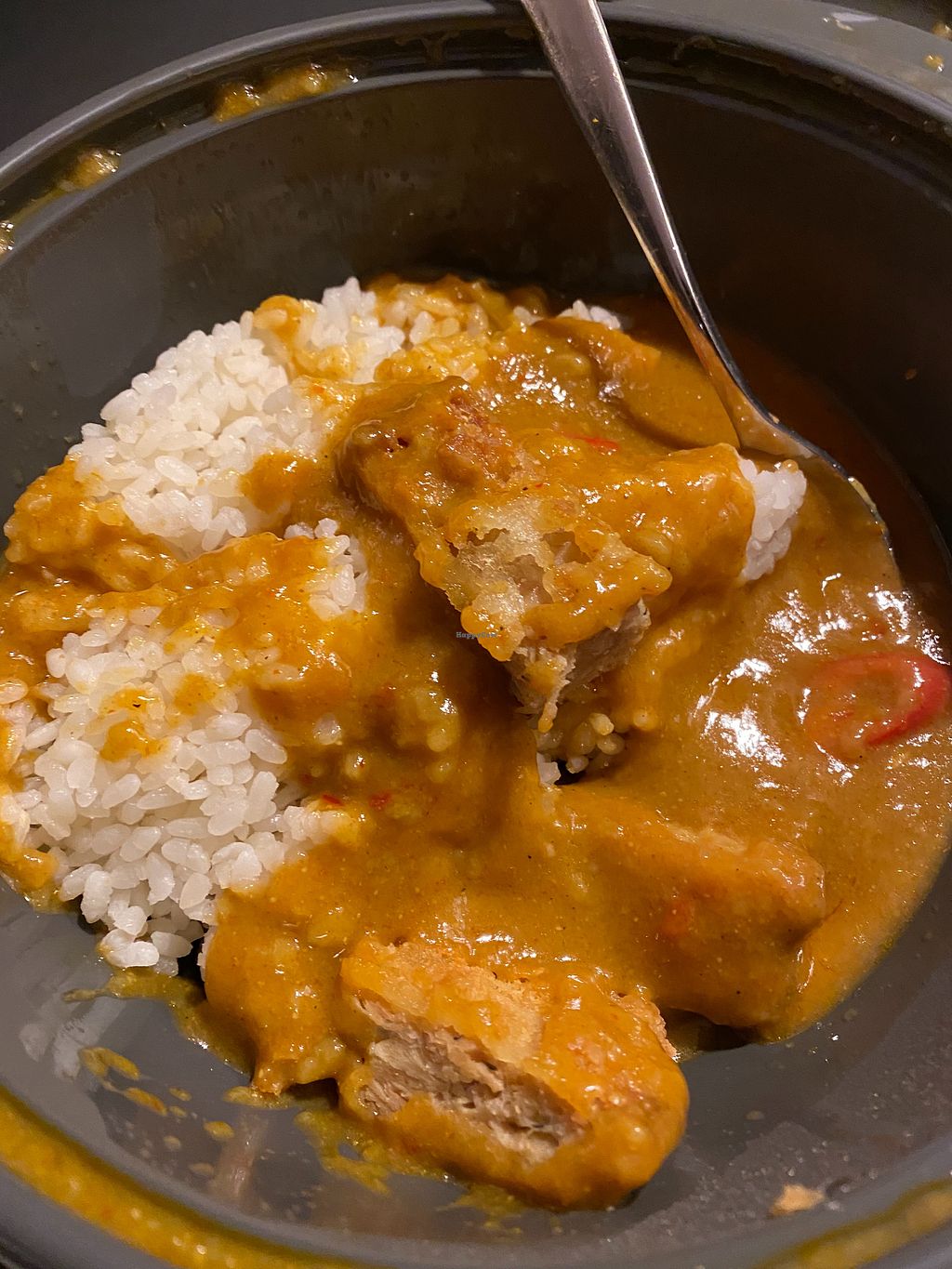 Takeaway vegan katsu curry and rice