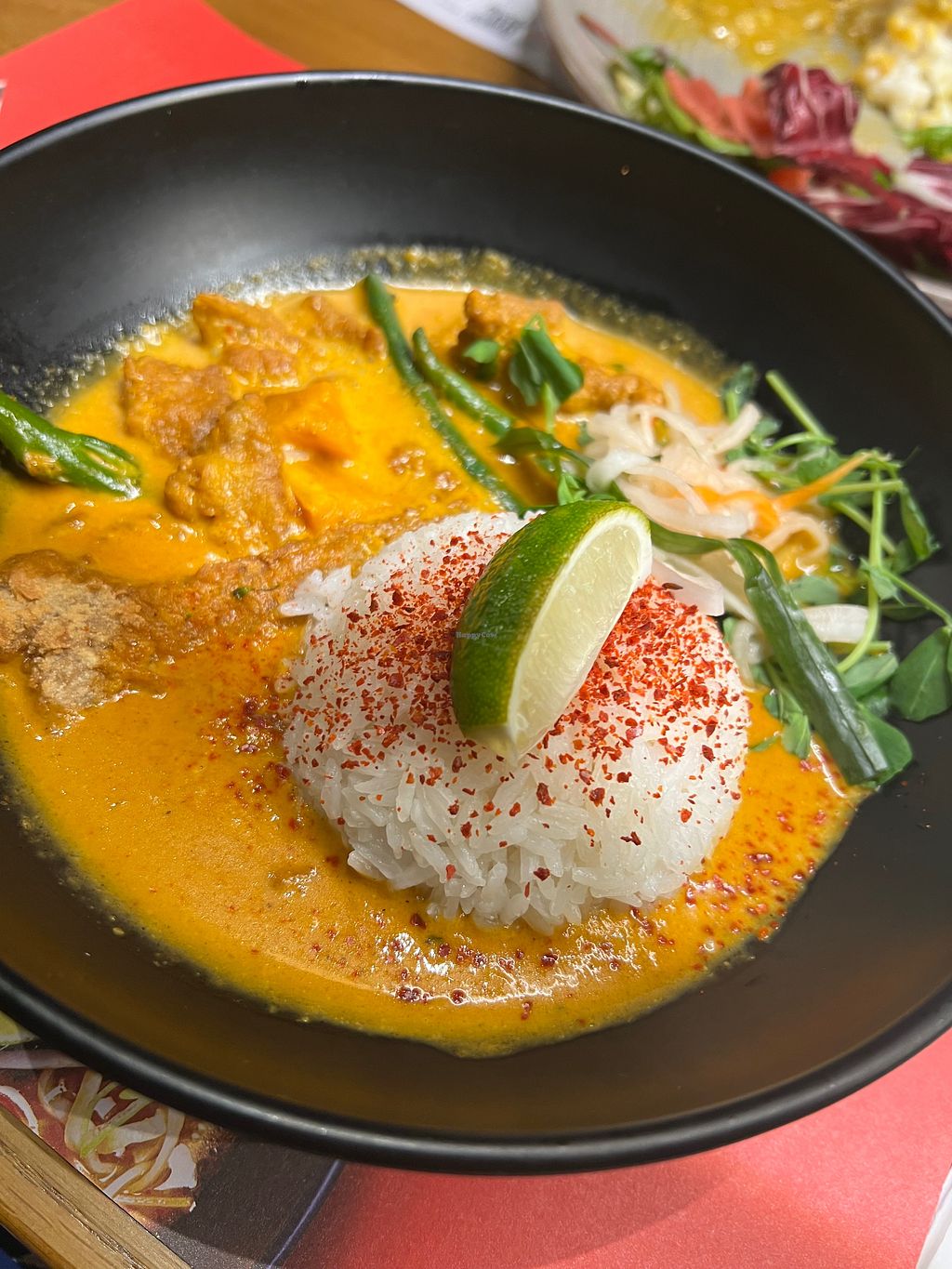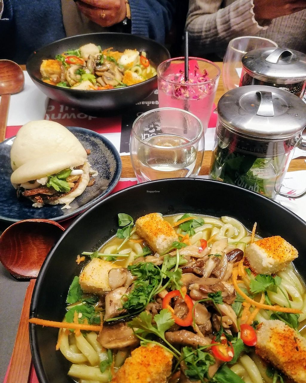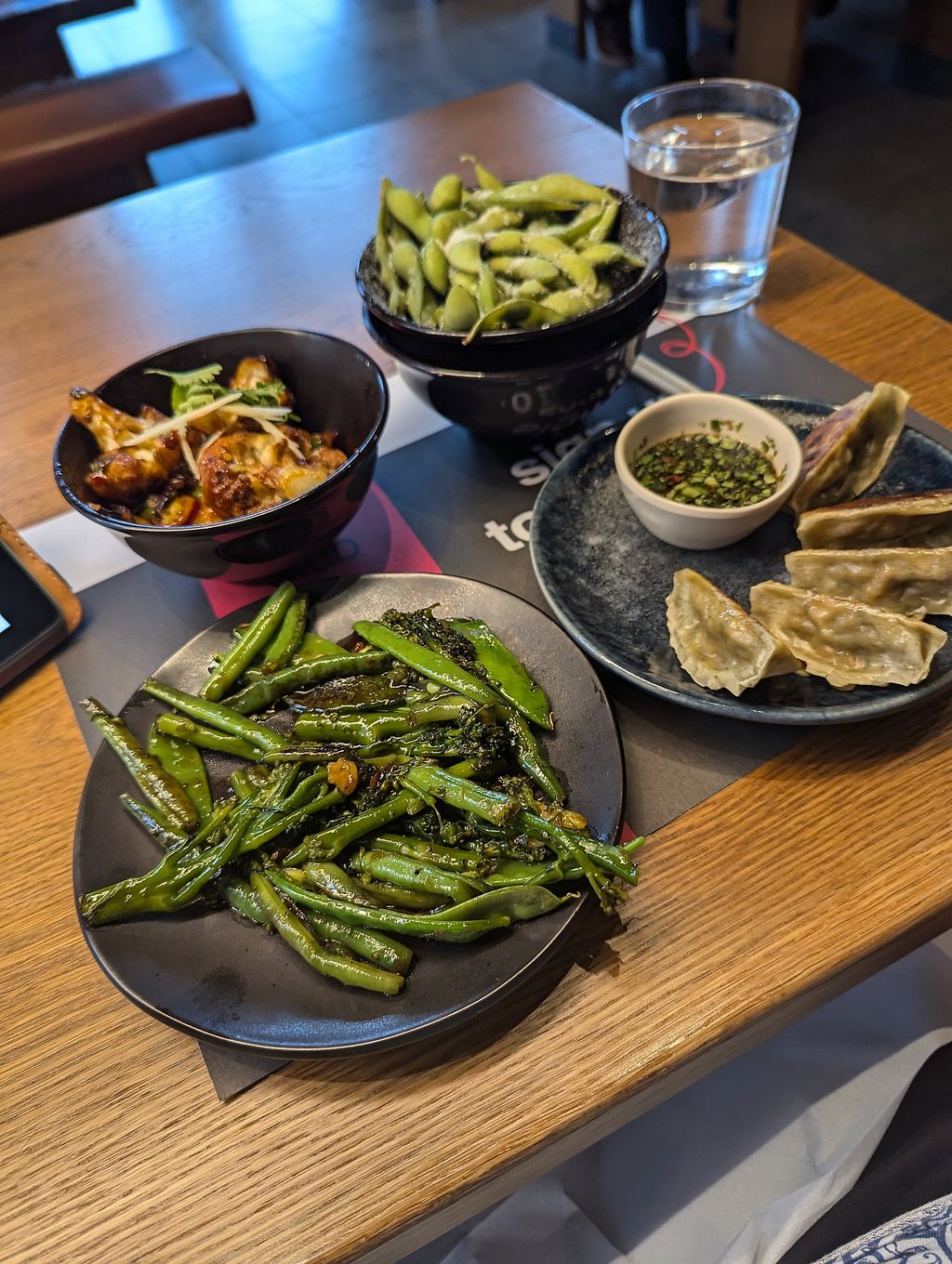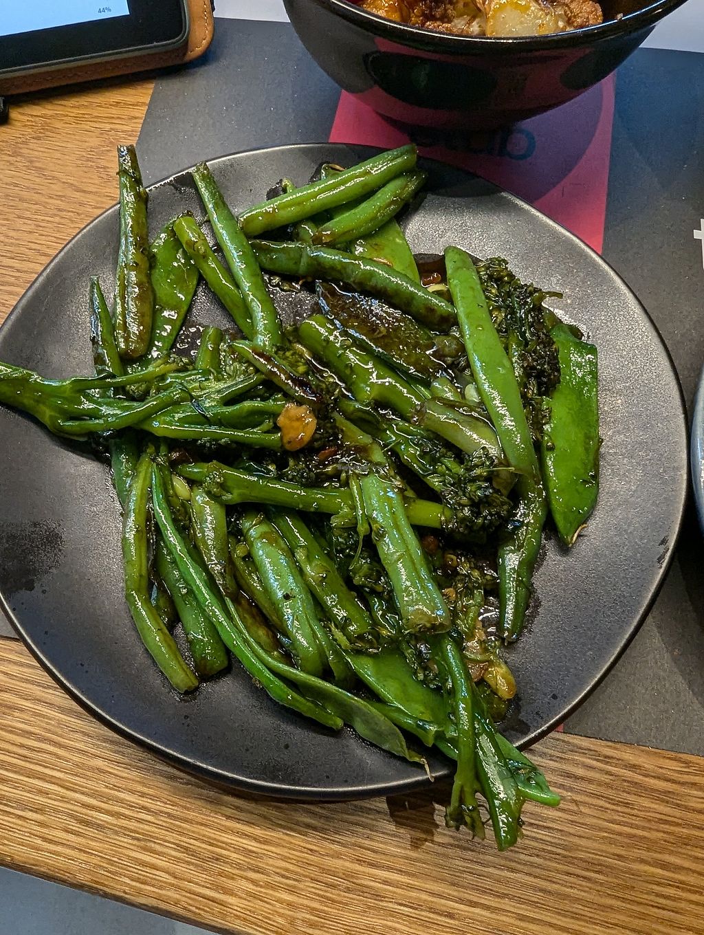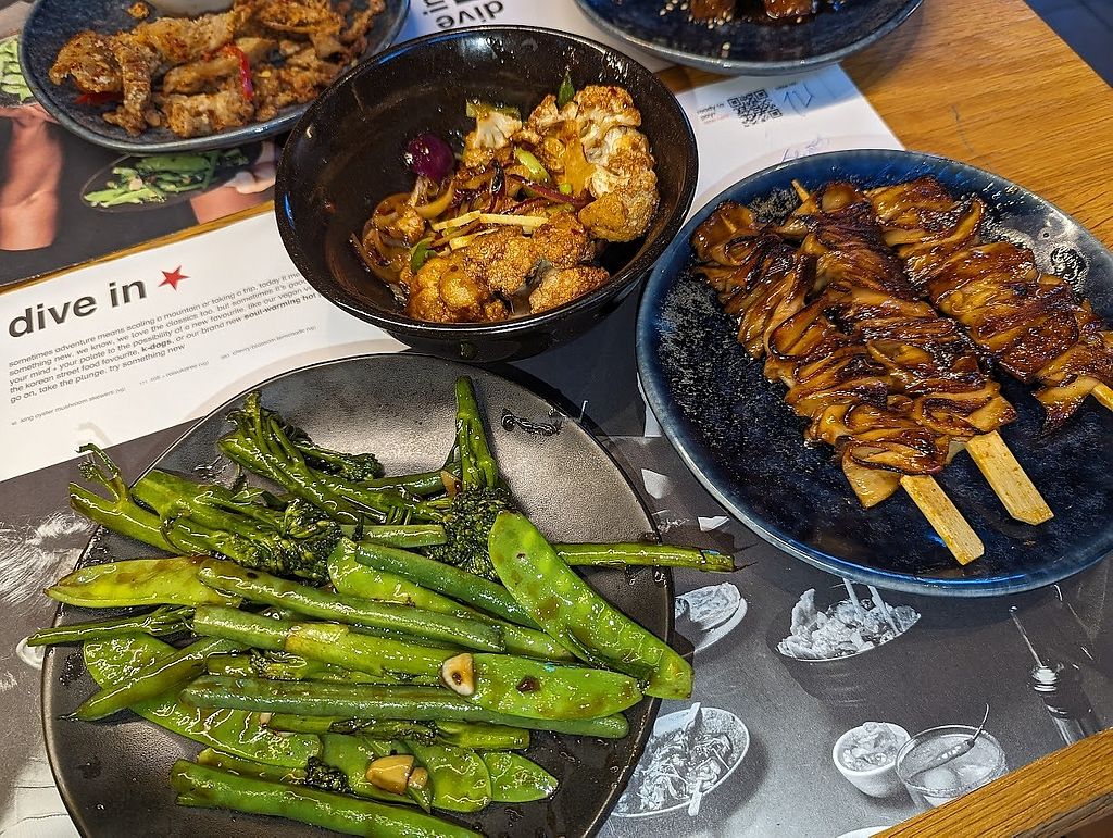 Mushroom skewers with garlic greens and bang-bang cauliflower