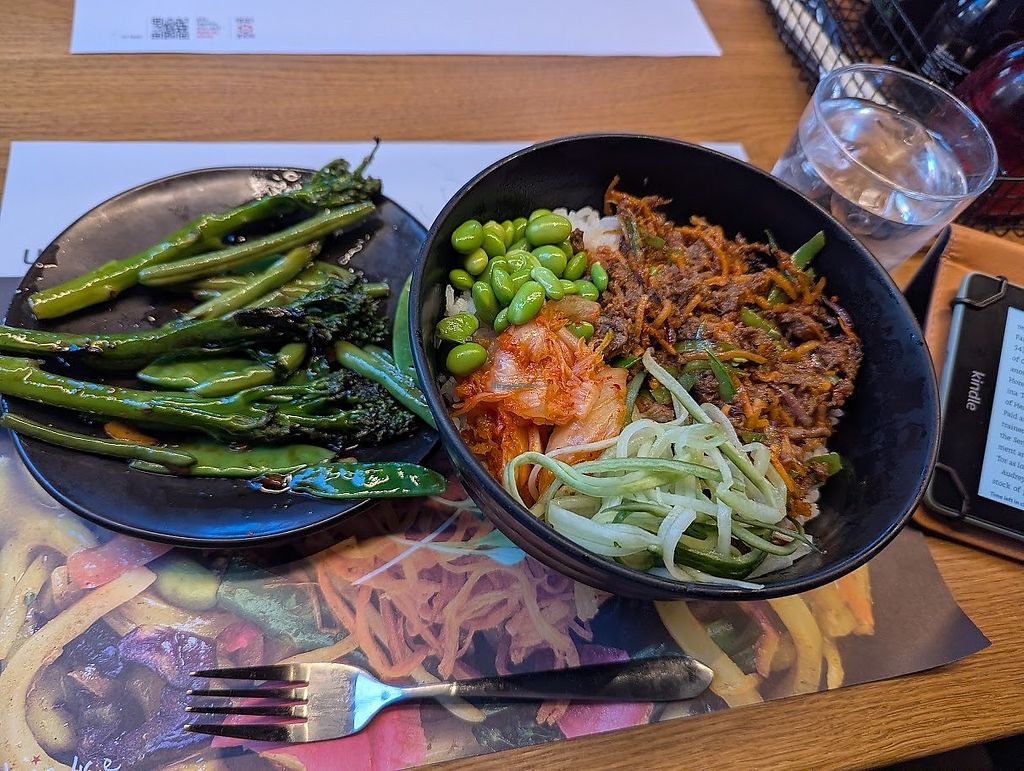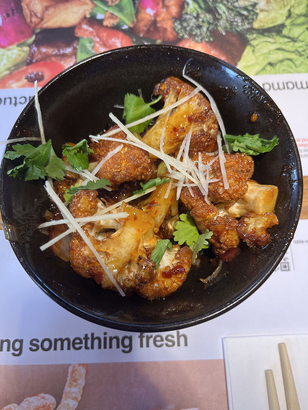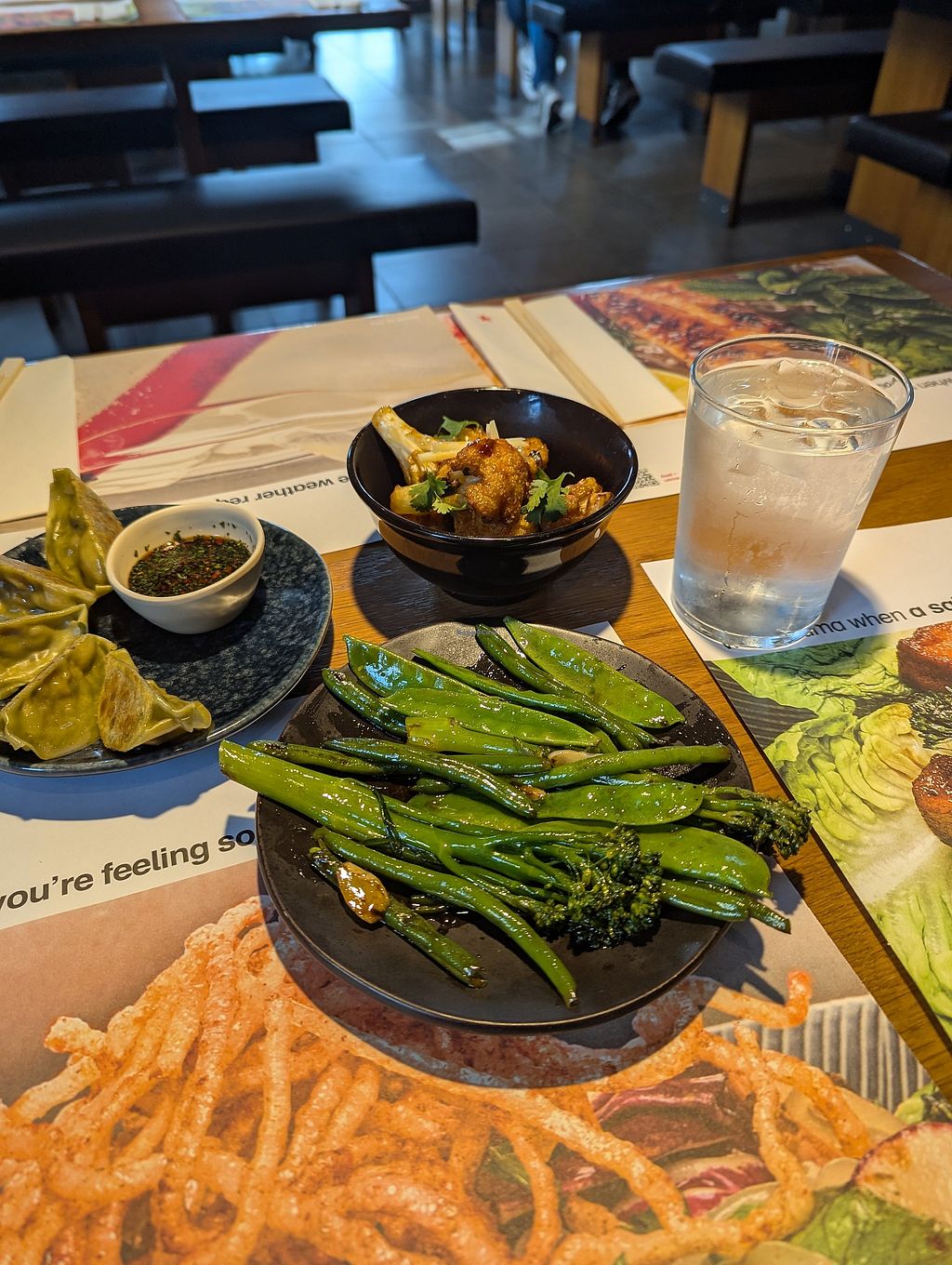 Vegetable gyozas, bang bang cauliflower, wok fried greens