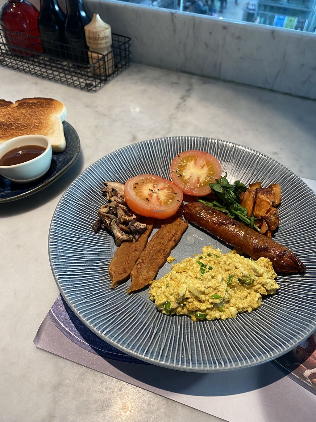 I was waiting to board a long flight to Shanghai so I was happy to see Wagamama, I was all set to have the vegan katsu curry but as it was early I noticed the vegan breakfast, on paper it sounded great and I opted to try something new instead of my usual go to. Where do I begin, hmmm, ok the toast was toast on one side and still bread on the other, the tempeh bacon was too small & just ok, the beetroot sausage again was just ok, the sweet potato wasn't cooked, the amount of spinach was more of a decoration but the tofu scramble was really tasty. I wish I'd gone with the vegan katsu curry now.