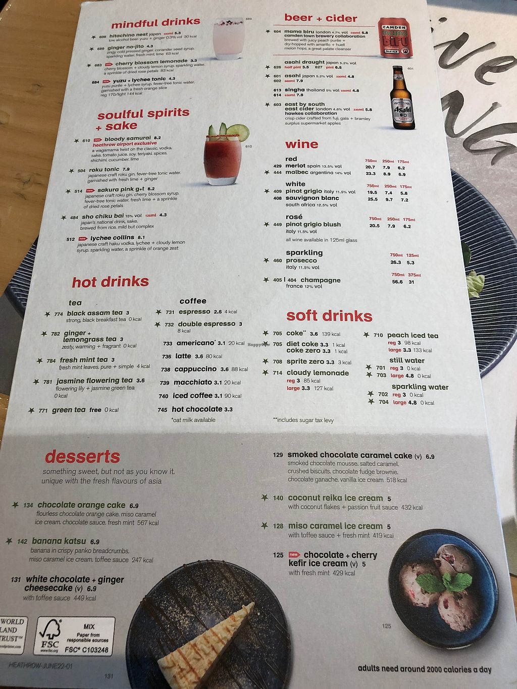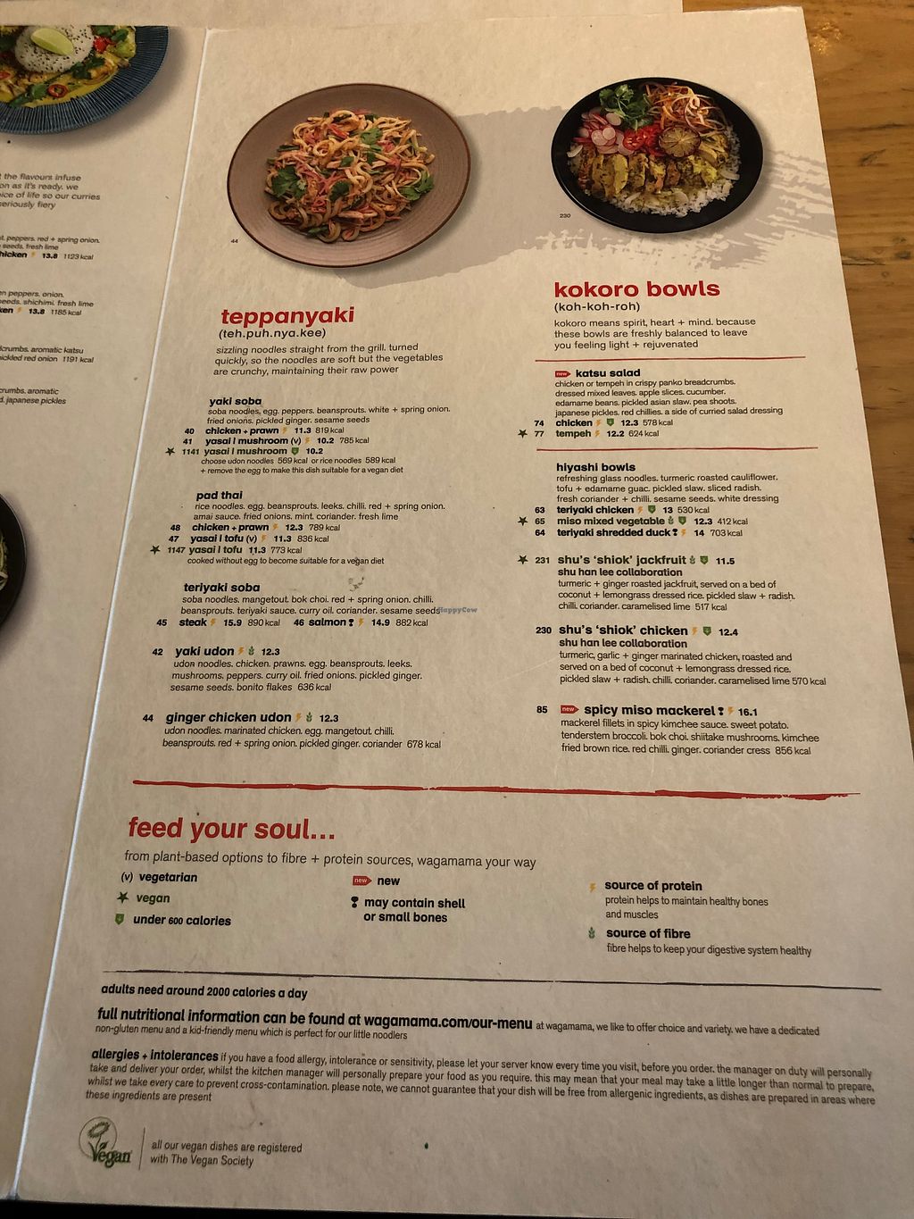 Wagamama impressed me by marking, not only the items they intentionally made vegan, but the items that were already vegan including the espresso and the soft drinks. They even had a good selection of vegan desserts which is something you don’t see every day.