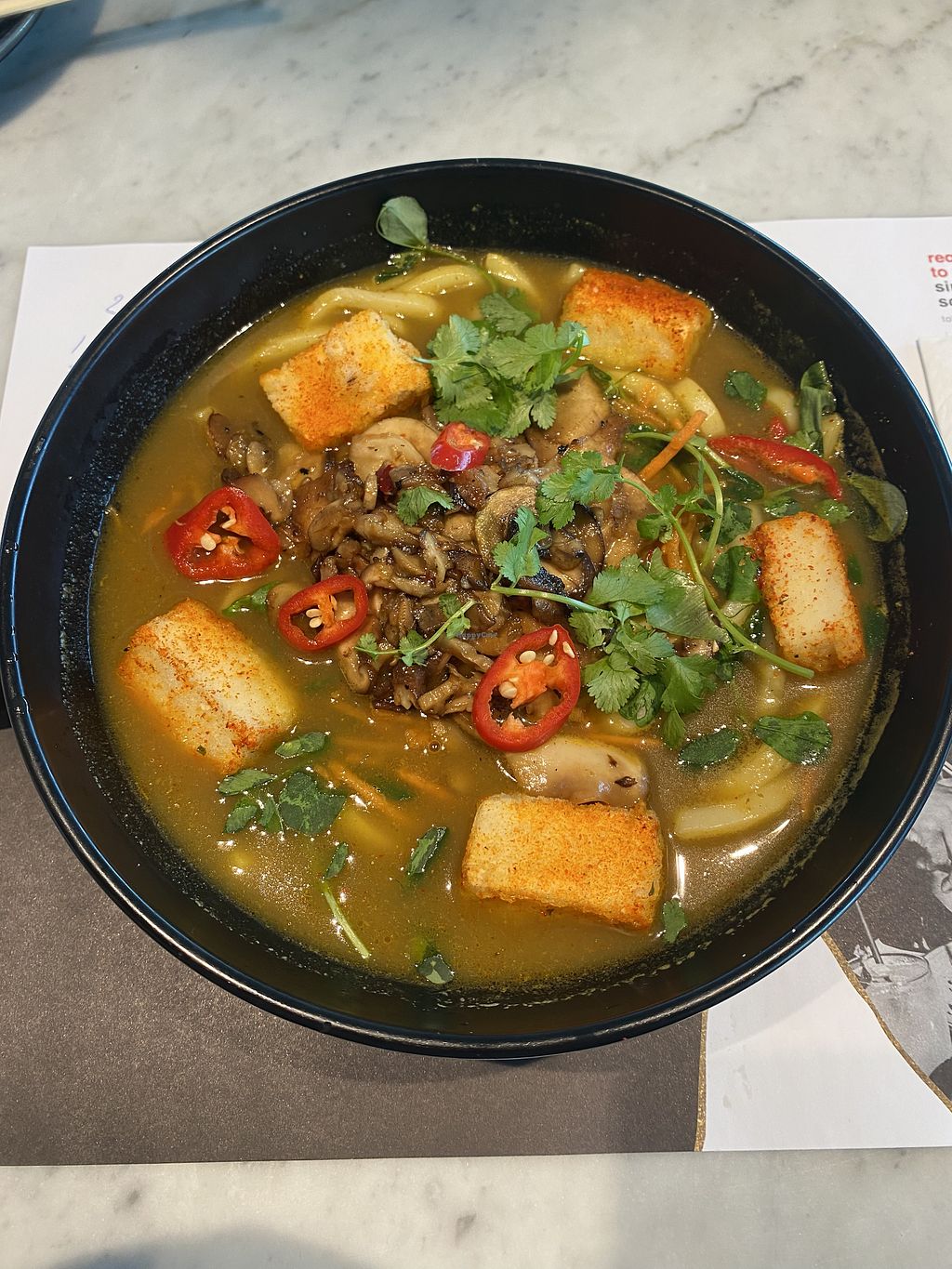 lots of options here for vegans and it was food that truly nourished the soul. i had the teriyaki vegan chicken udon ramen with a vegan egg and a beet juice. so happy to have a full belly before my flight.