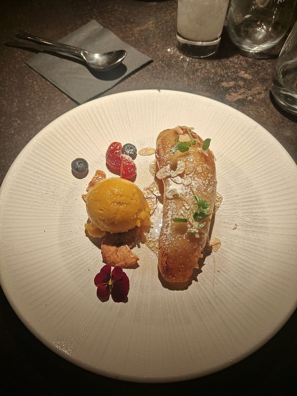 Deep-fried banana served with almonds, strawberries and mango sorbet.