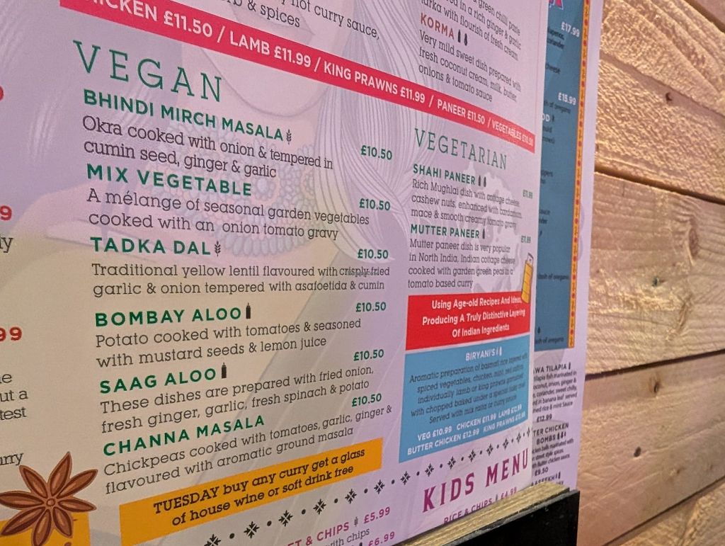 Clear Vegan section on the menu, staff were very knowledgable and checked what we were happy with without being asked, Vegan naan option was great! Food was super tasty, really delicious and large portions.