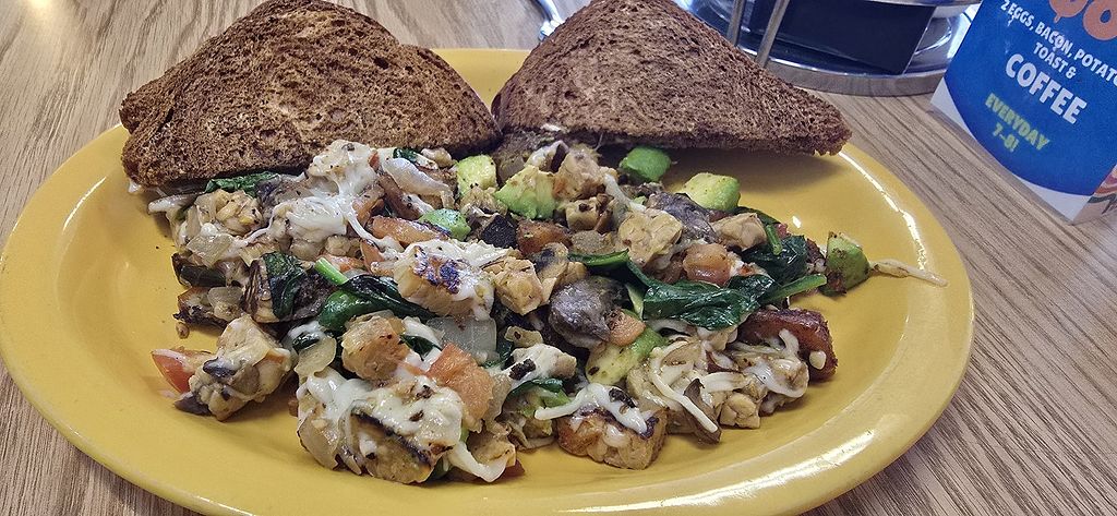 Read moreThe tofu "scramble" is just giant cubes of un-seasoned tofu --- you have to smash it up with your fork if you like the scramble texture and even then there's no real flavour since tofu is tasteless. You can add veggies to lots of things though.