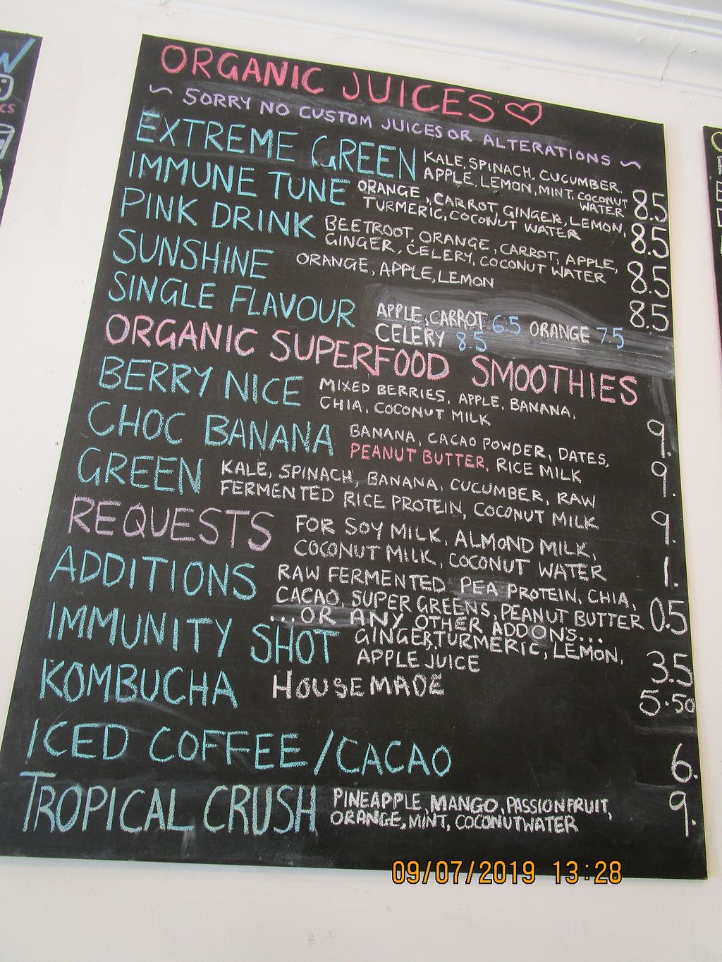 Juices/smoothies menu