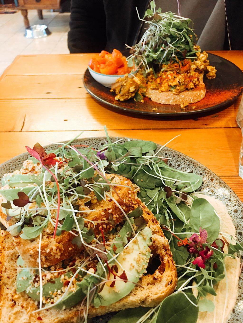 Scrambled tofu, mush, spinach and tomato AND the smashed avo and vegan…