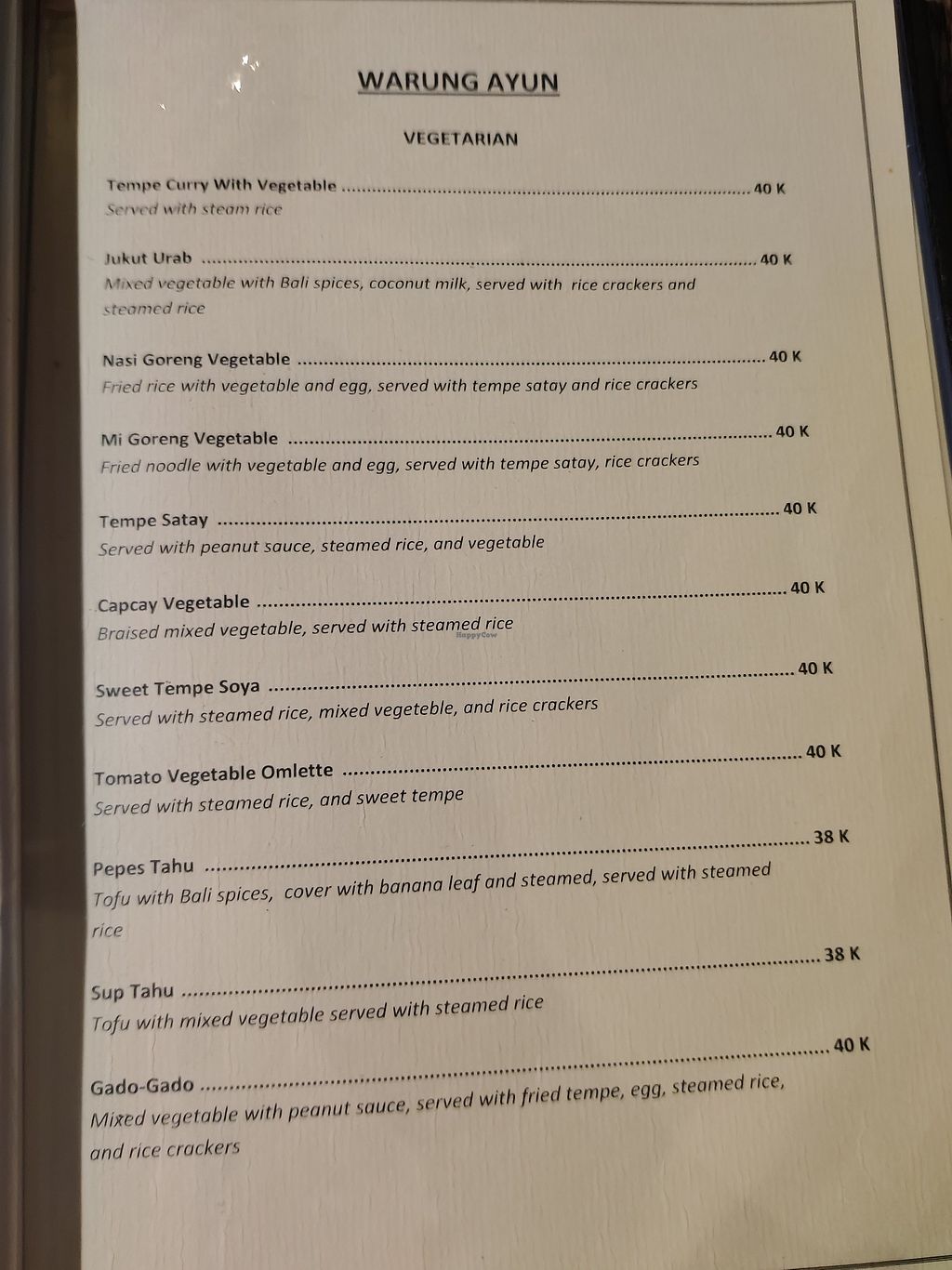 Lacto Ovo Honey Non-veg Serves meat, vegan options available. Restaurant offering traditional dishes such as tempe curry with vegetables, jukut urab, and tempe satay. More