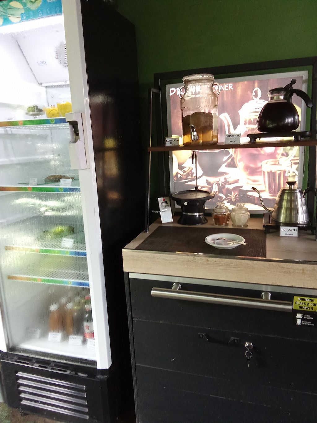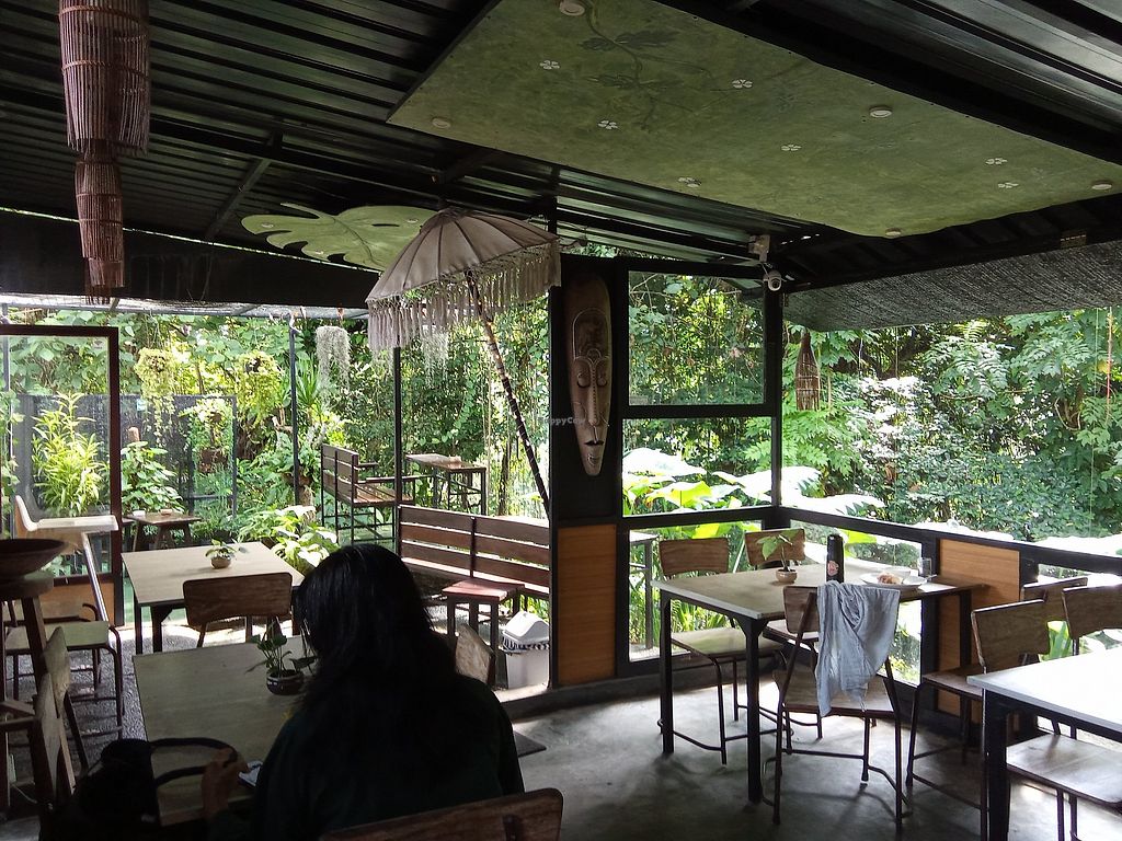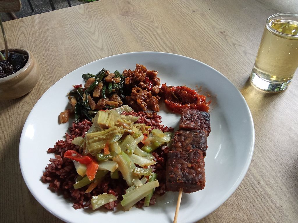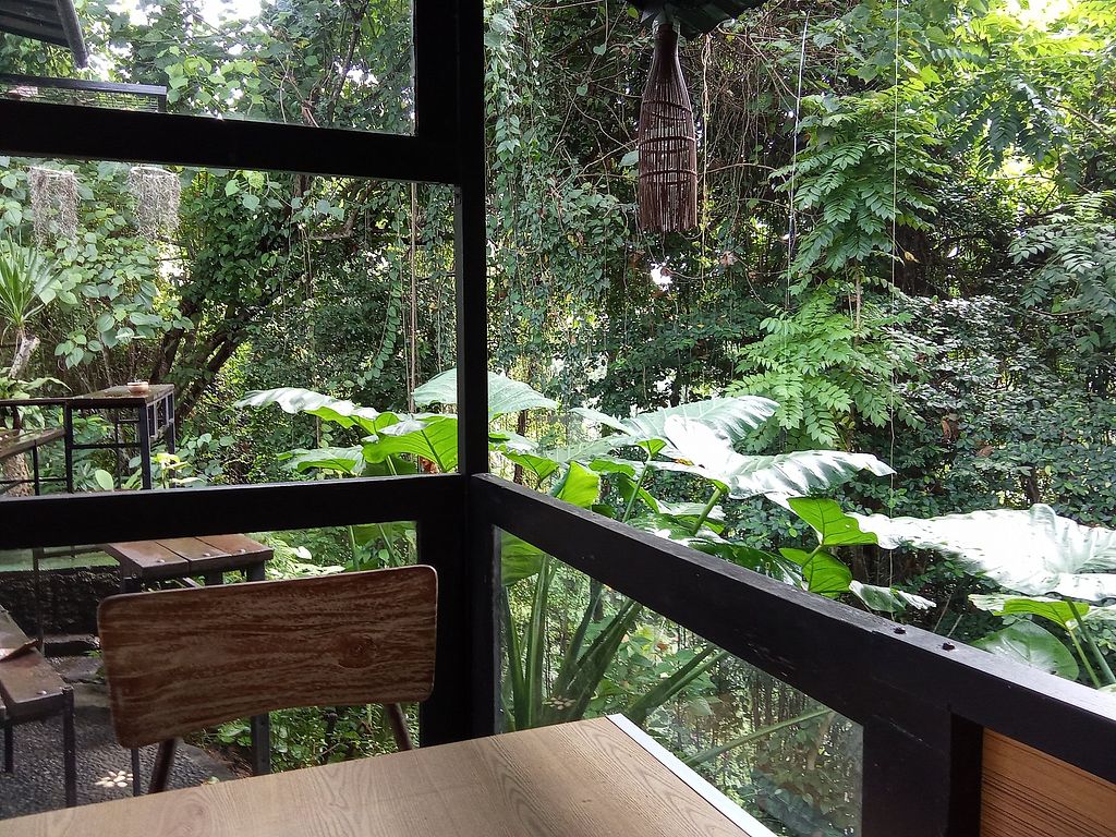 Located by the road with a parking space. Has a jungle view. Serves tempeh, clear soup, red rice vegan cakes, kombucha, Balinese coffee and more.