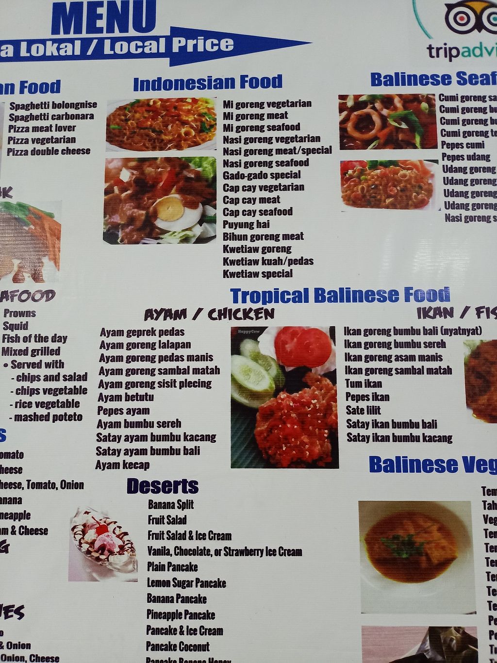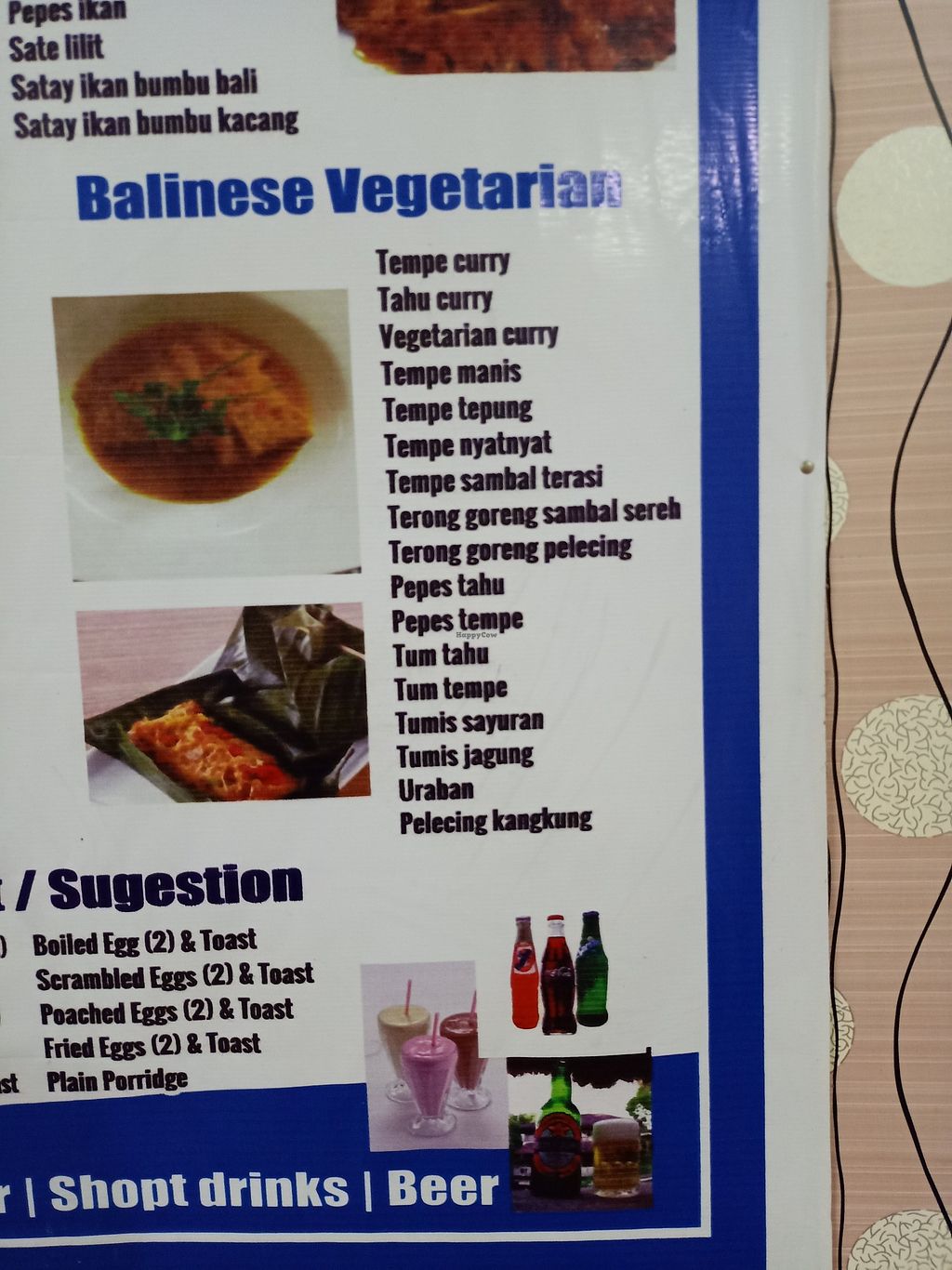 Variety of Balinese, Indonesian and European dishes. Many Balinese ones are vegan by default but staff is happy to answer any questions and explain, also modify vegetarian meals to vegan. Good prices and tasty homely meals.