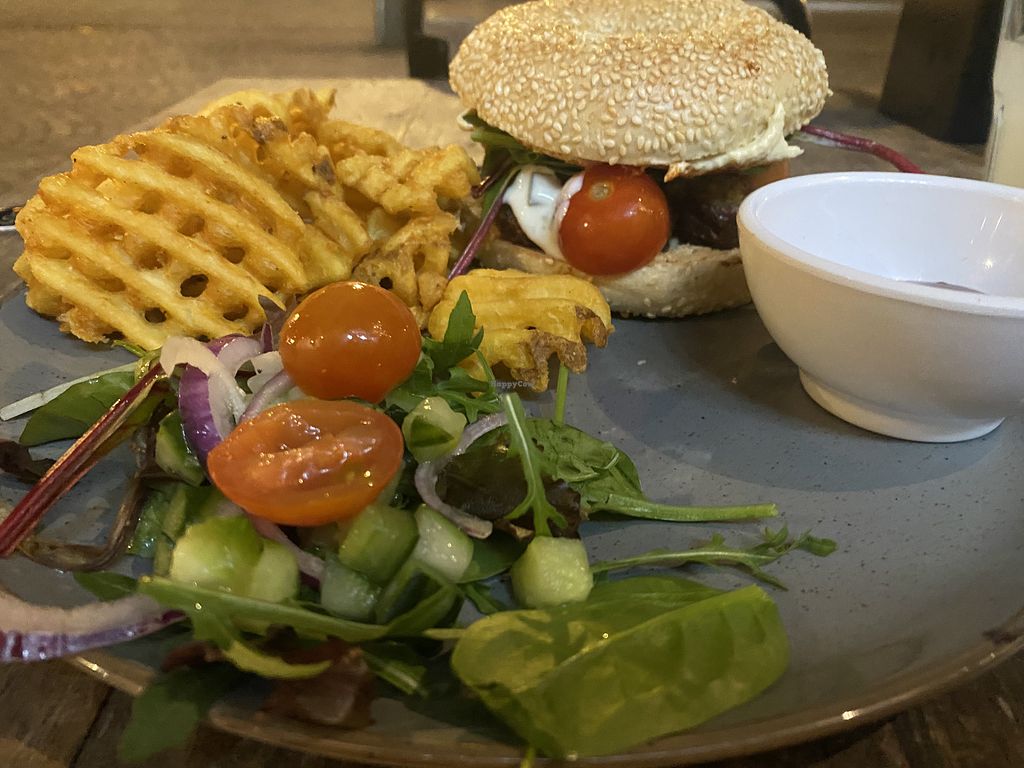 The falafel bagel was delicious!!! Waffle fries were included in the price so very decent and it’s the first filling meal I’ve had since being here! Will definitely return.