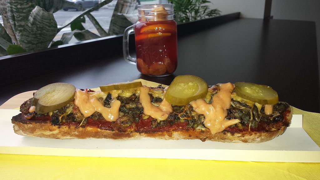 Zapiekanka with mushrooms, vegan cheese, chives, onions + garlic mayo