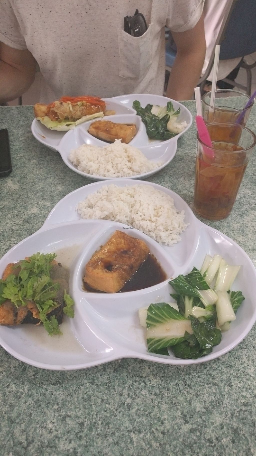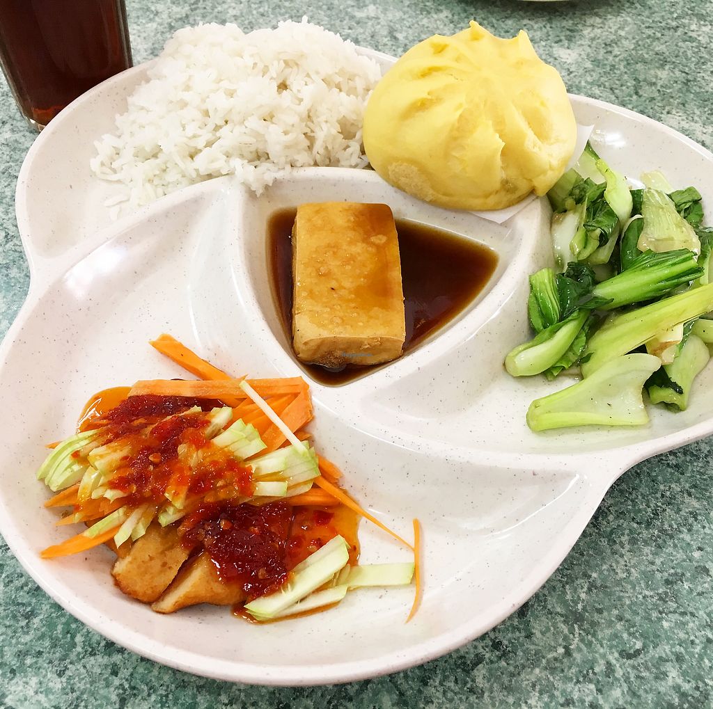 vegan chick'n, tofu, book choy, & steamed bun set. comes with cold her…
