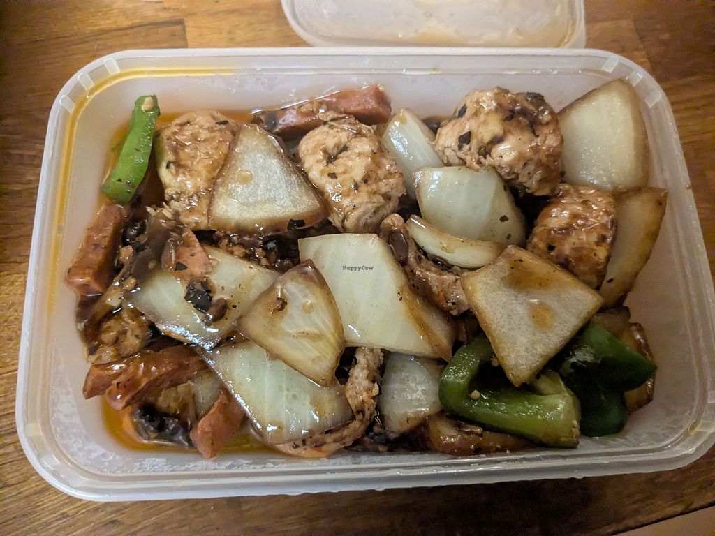 Black bean mock chicken, boiled rice and curry sauce