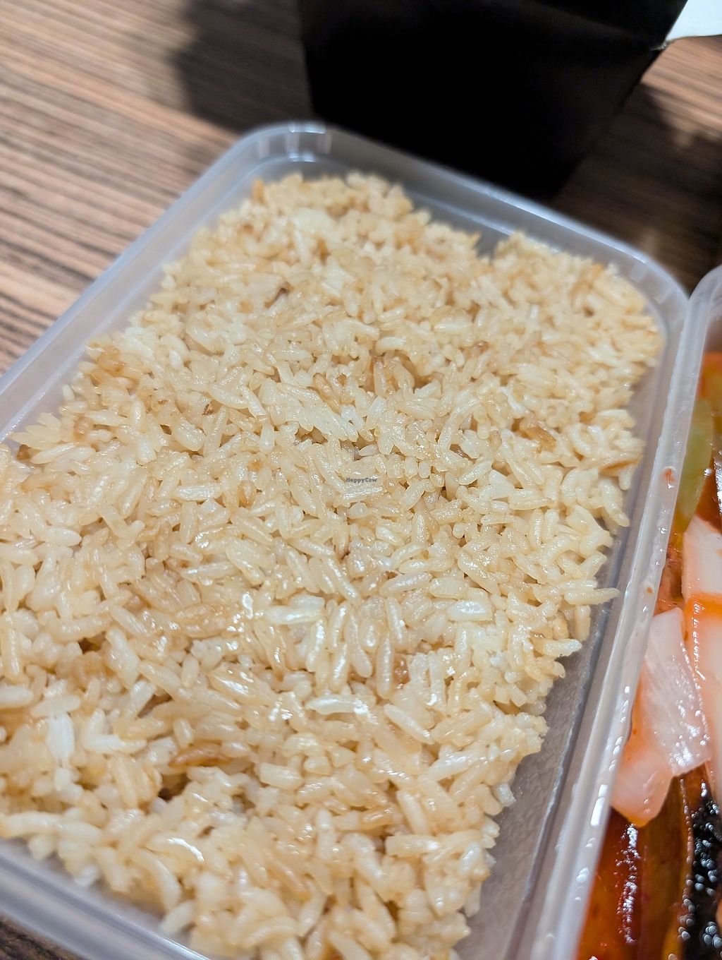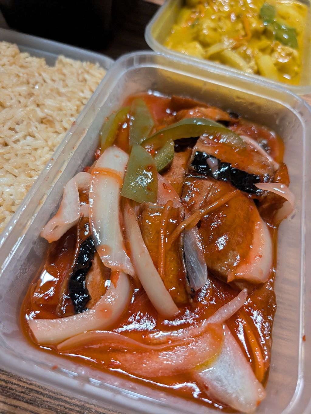 Tofu in garlic sauce on the left, mixed veg in ok sauce on the right w…