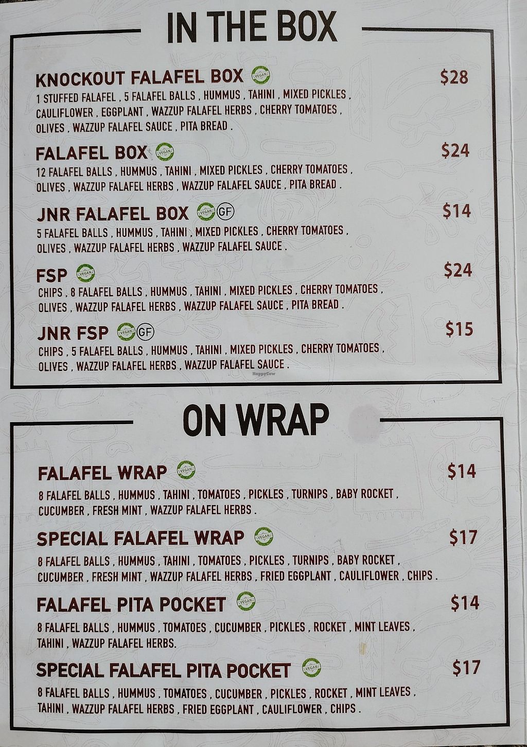 Read moreOn this visit we enjoyed a pita pocket $14, falafel box $24 (great value), large chippies $12 (we really could have ordered the small but weren't sure what how large the meals would be)and a cauliflower side $1.50, with a mint/sage tea $3.50ea. Great quality and good value.