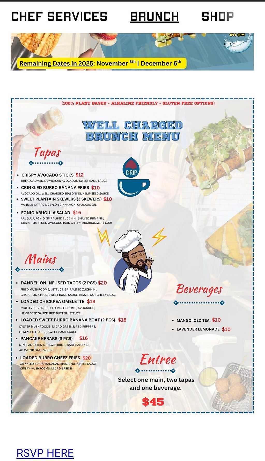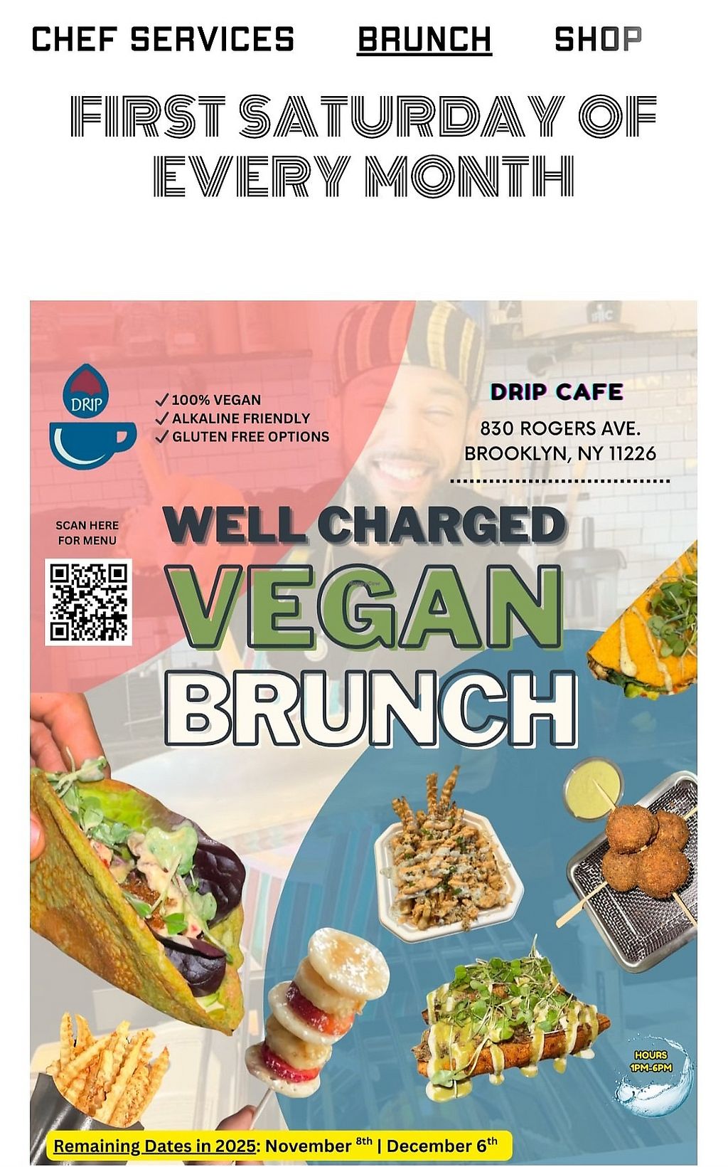 A fully plant-based private chef and catering service providing in-home dining experiences for events of any size. Menus are custom-created for each event and include dishes such as tacos, vegan omelettes, sweet plantain skewers, and fonio arugula salad. The service operates in the New York, Tri-State Area, and The Hamptons, and is open to domestic and international travel. It also operates as a vendor at vegan festivals in the New York and New Jersey area.