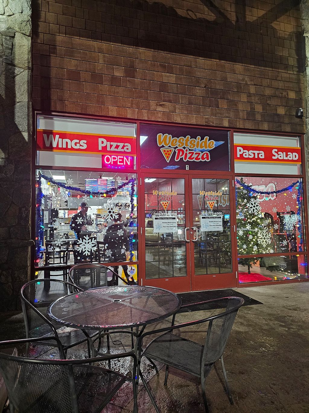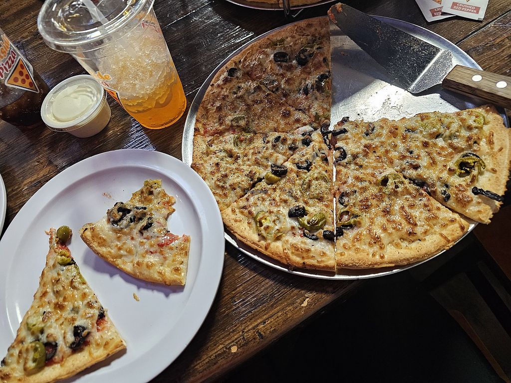 Serves meat, vegan options available. Family-friendly pizza place with arcade games and group seating available. Offers a vegan cheese option, mushroom & olive pizza with vegan cheese, thin crust pizza with vegan cheese, and gluten-free pizza with vegan cheese. Open Mon-Wed 11:00am-8:00pm, Thu-Sat 11:00am-9:00pm, Sun 11:00am-8:00pm.