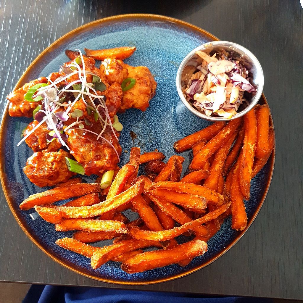 Homemade jerk fake chicken with sweet potato fries and lime slaw