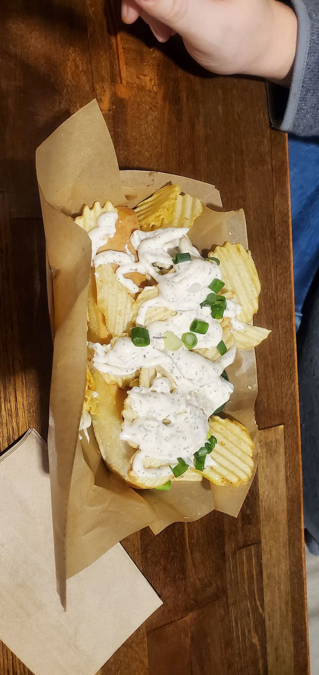 Double Dog Dare. Two vegan chili cheese dogs. I added Valentina, Sarah…