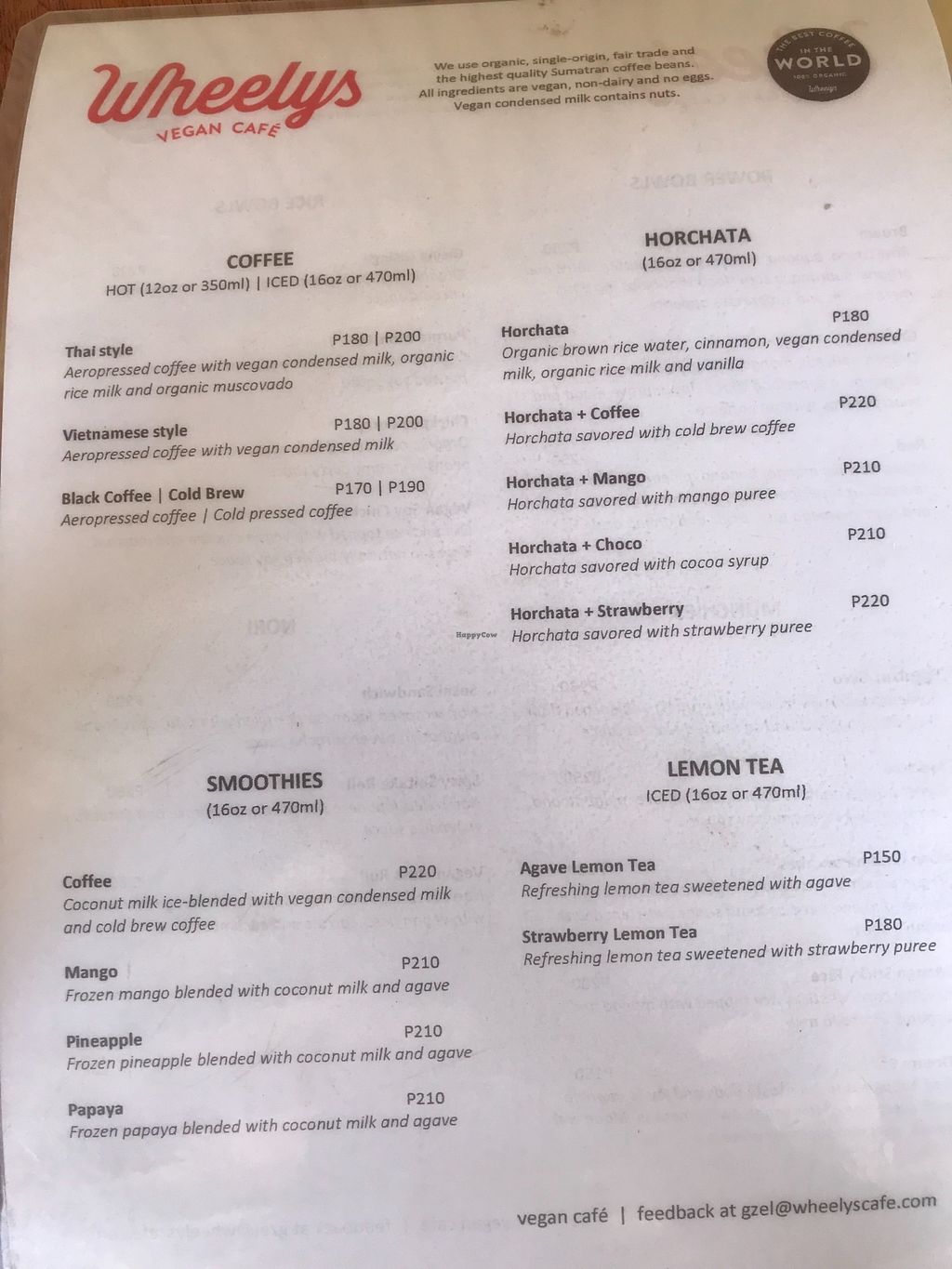Two-storey vegan restaurant on the main road in General Luna. Serves smoothie bowls, rice bowls, nori rolls, shawarma, gyro, japchae, coco pancake, mango sticky rice, and ice cream bars. Beverages include coffee, horchata, shakes, and lemon tea. Part of Wheely's Vegan Cafe franchise. Reported closed September 2022.