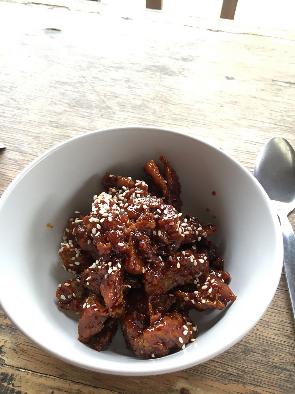 small place on busy road. tastes great. all vegan. you can watch the chefs prepare your food from upstairs seating area. not the place to chill out and relax but get a quick meal in a bowl then go to your next foodtrip spot