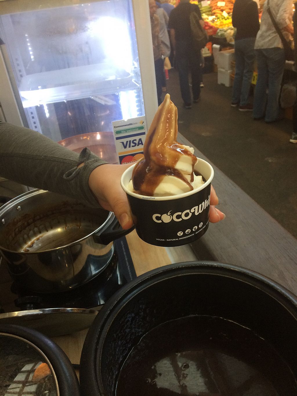 Stall at the Fremantle Markets selling CocoWhip, a vegan coconut soft serve ice cream, with toppings such as raw slices, raw peanut butter cups, apple crumble, banoffee sauce. No place to sit but can sit near to the stall. Reported closed, Mar 2019.