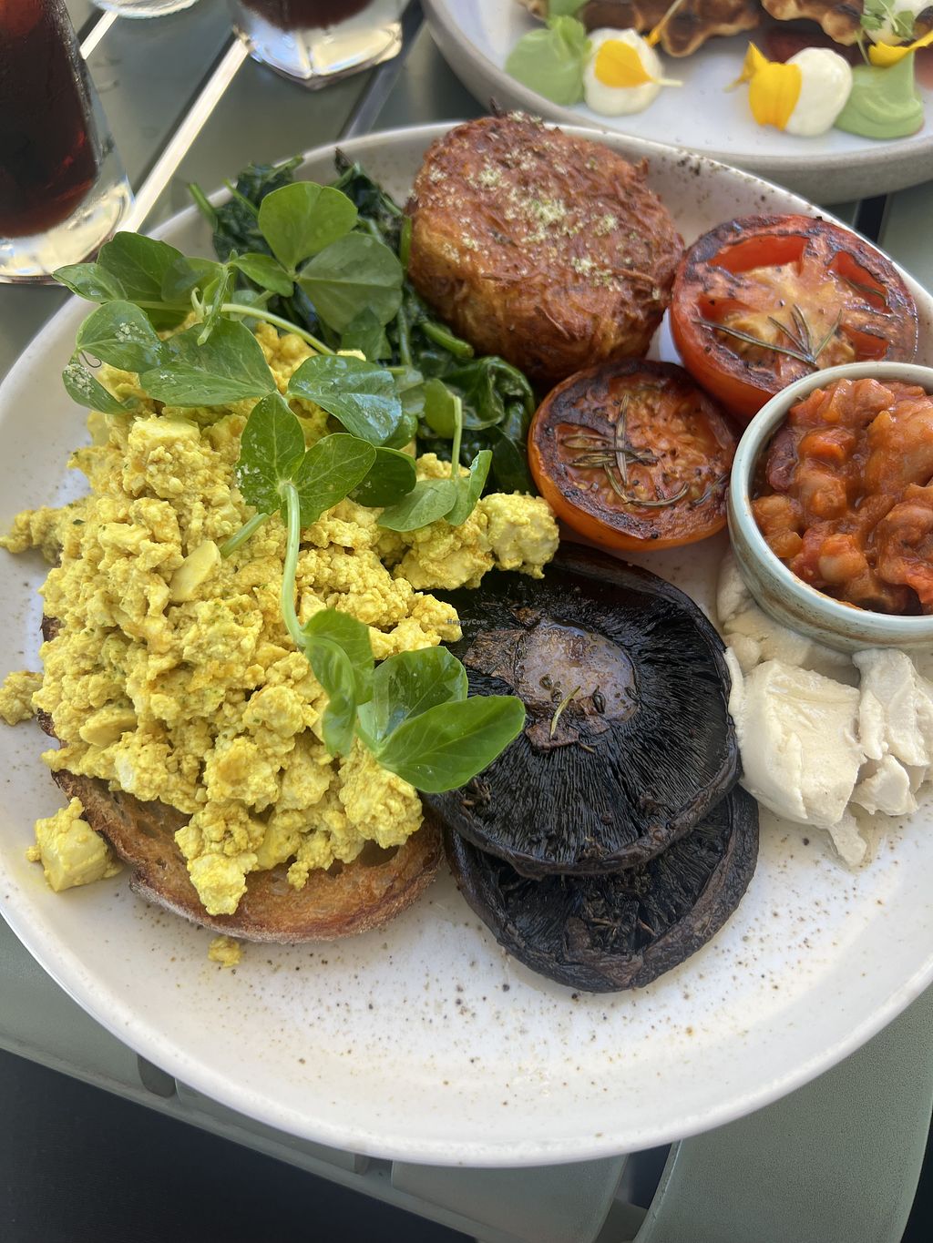 Awesome full vegan breakfast - hash brown, home cooked beans, mushroom, spinach, scrambled tofu on toast, roasted baby tomatoes, with vegan tofu. A few other options but I have had this both times. Served all day.